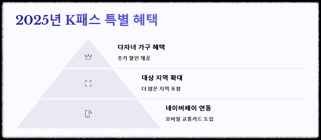 2025년에는 다자녀 가구 혜택 확대, 대상 지역 확대 등 더욱 풍성해진 혜택이 기다리고 있습니다. 지금 바로 K패스를 신청하고, 똑똑한 교통비 절약 생활을 시작하세요!