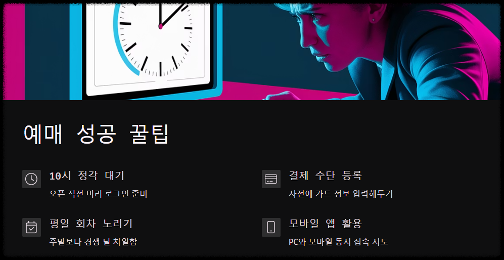예매 오픈과 동시에 빠르게 매진되는 만큼, 10시 정각에 맞춰 미리 로그인하고 결제 수단을 등록해두는 것이 좋습니다. 특히 주말 회차는 경쟁이 치열하니, 평일 회차를 노려보는 것도 좋은 전략이에요.