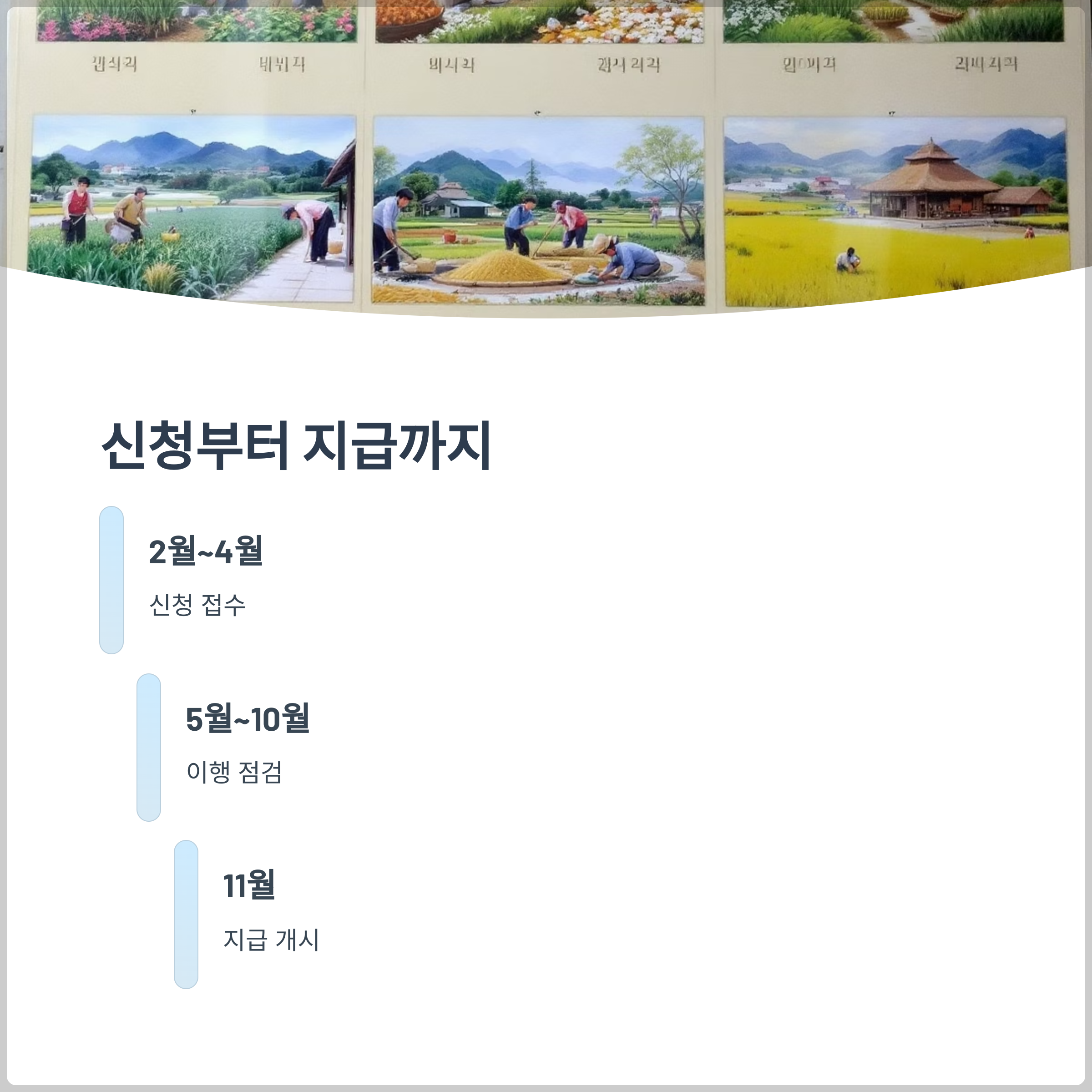 | 11월 | 지급 개시 | 계좌로 공익직불금 입금 시작 |