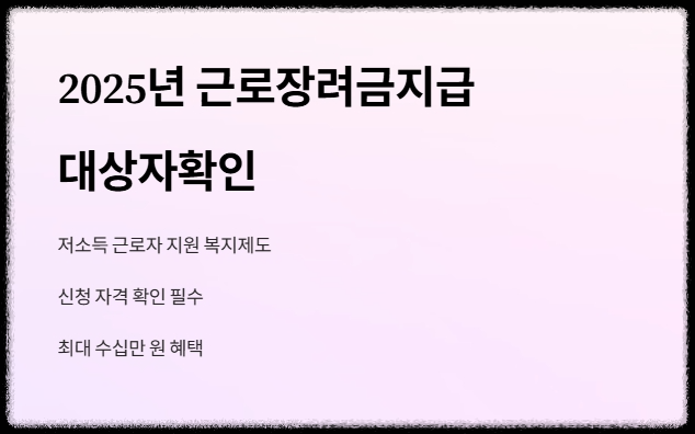 근로장려금지급대상자확인 방법부터 소득 요건, 재산 기준까지 2025년 신청 전에 꼭 알아야 할 정보를 쉽고 정확하게 안내합니다. 신청 대상 여부를 지금 바로 확인하세요.