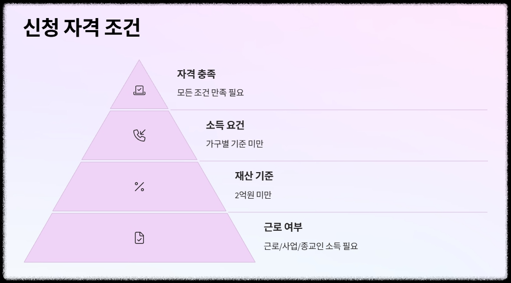 | 지급 대상자 조건 | 가구 유형별 총소득 요건과 재산 기준을 모두 충족해야 합니다. |
