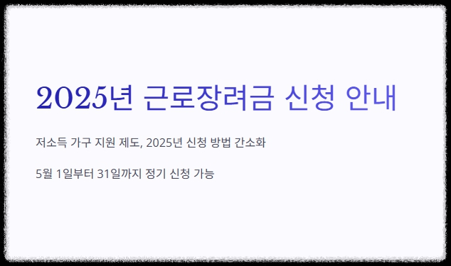 2025년 근로장려금 신청 자격, 방법, 유의사항까지 한눈에 정리했습니다. 손택스 모바일 신청부터 제출 서류, 신청 기한 등 핵심 정보로 혜택을 놓치지 마세요.