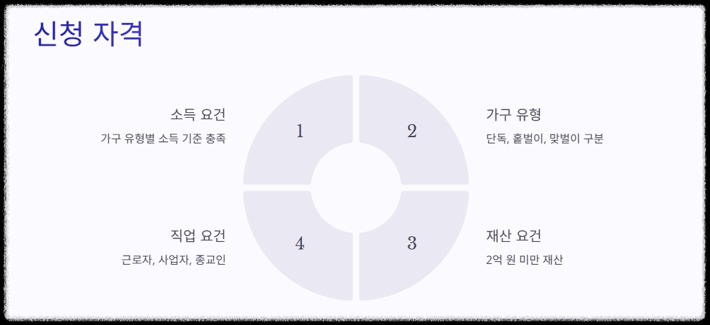| 신청 대상 | 근로·사업·종교인 소득자 중 가구원 요건과 소득요건 충족 시 |