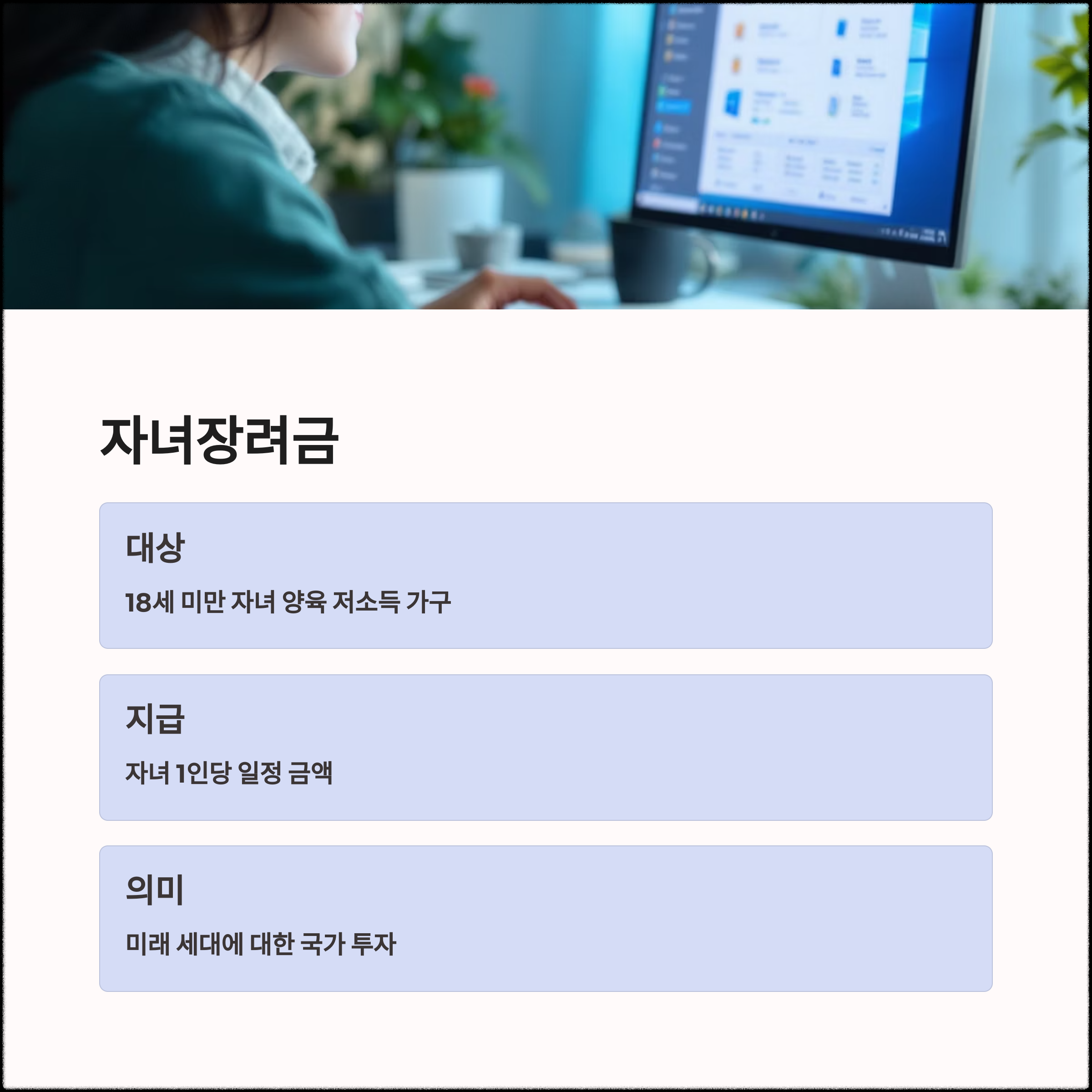 자녀장려금은 18세 미만의 자녀를 양육하는 저소득 가구에게 자녀 1인당 일정 금액을 지급하는 제도입니다. 자녀 양육에 따른 경제적 부담을 덜어주고, 미래 세대에 대한 국가의 투자라고 볼 수 있습니다.