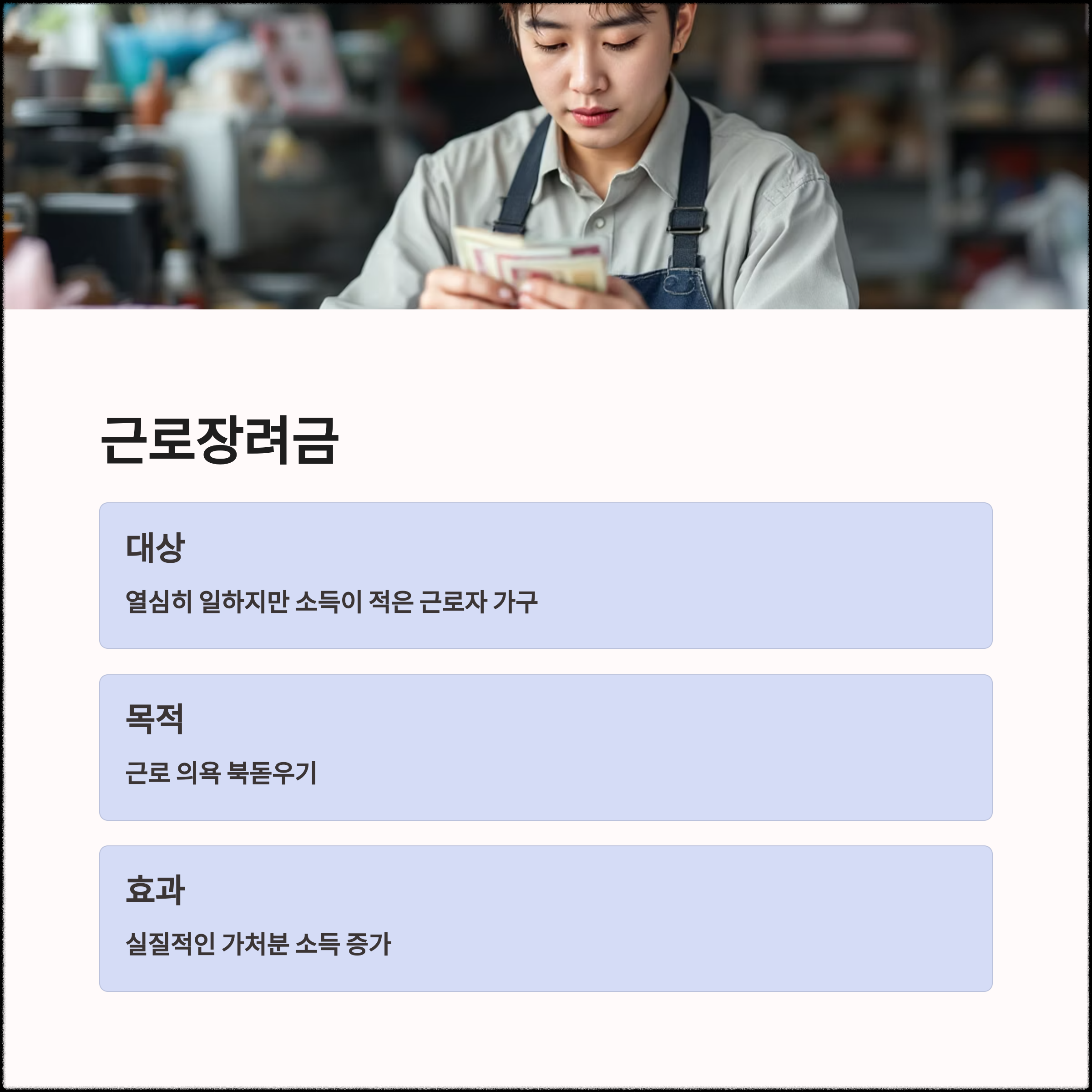 근로장려금은 열심히 일하지만 소득이 적은 근로자 가구에게 현금으로 지급되는 제도입니다. 일을 통해 얻은 소득에 비례하여 장려금이 지급되므로, 근로 의욕을 북돋우고 실질적인 가처분 소득을 늘려주는 효과가 있습니다.
