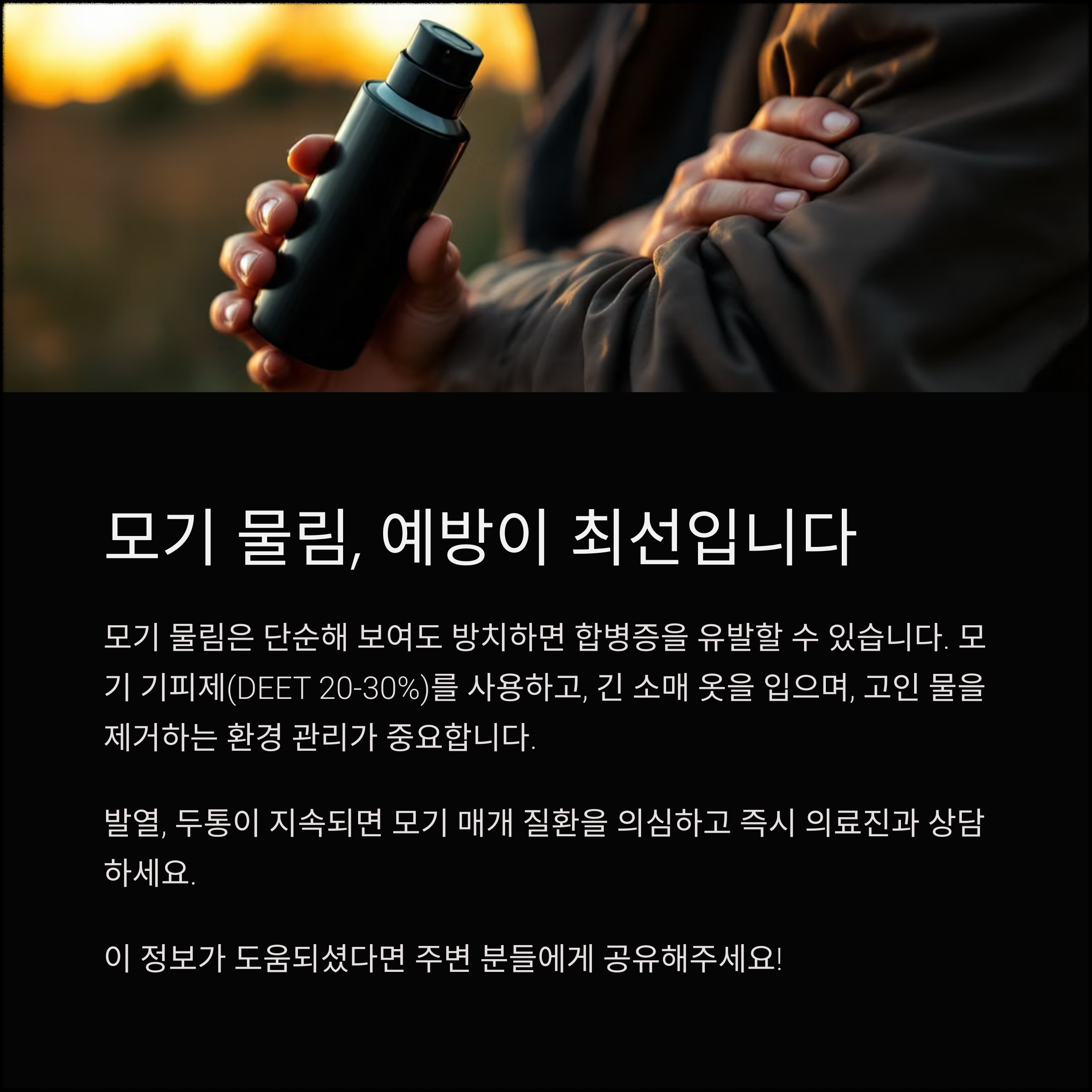 긴 소매 옷과 긴 바지 착용, 밝은 색 의류 선택, 향수나 화장품 사용 자제도 도움이 됩니다.