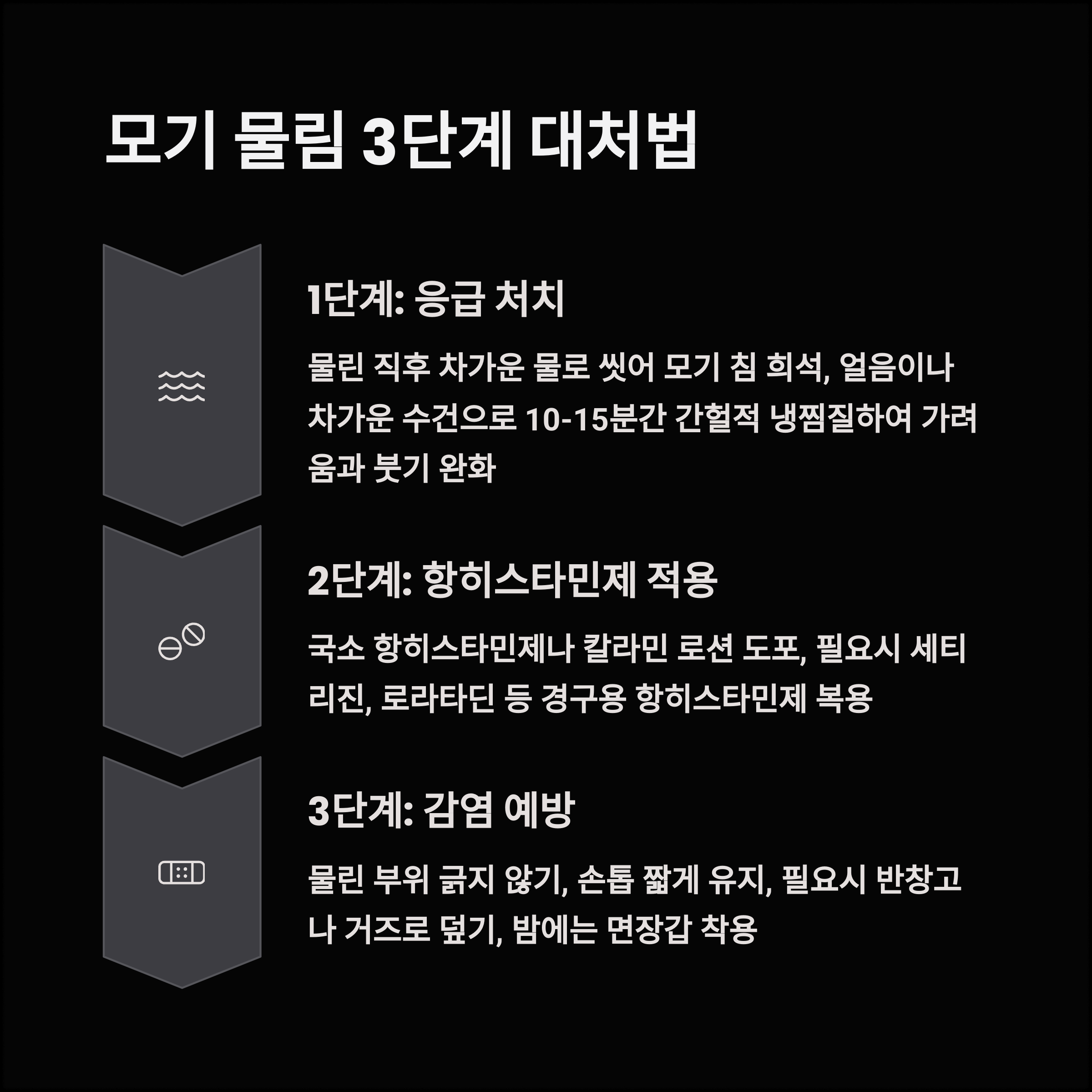 가장 중요한 것은 물린 부위를 긁지 않는 것입니다. 손톱을 짧게 깎고, 필요시 반창고나 거즈로 덮어 무의식적인 긁기를 방지해야 합니다. 특히 밤에 자는 동안 긁는 것을 방지하기 위해 면장갑을 착용하는 것도 좋은 방법입니다.