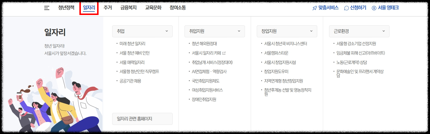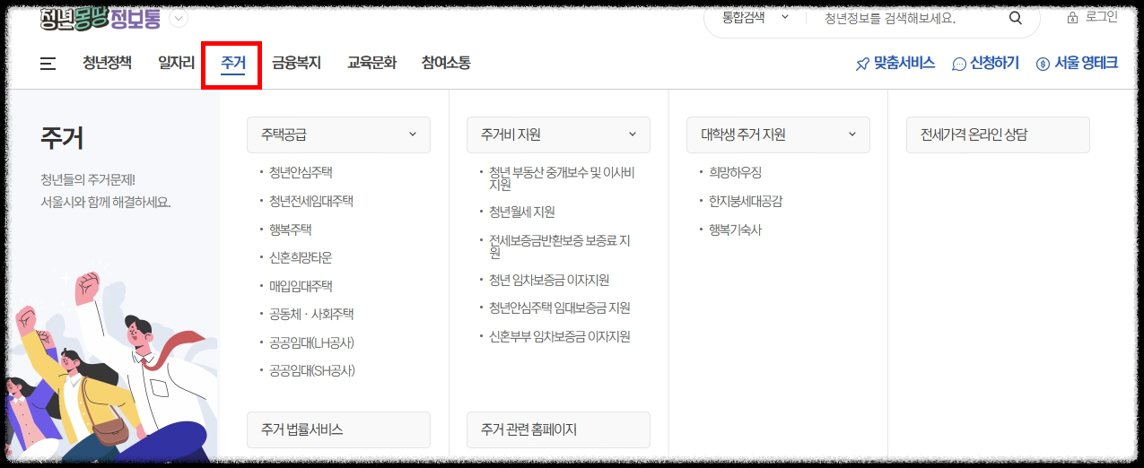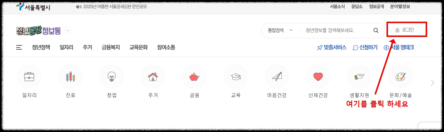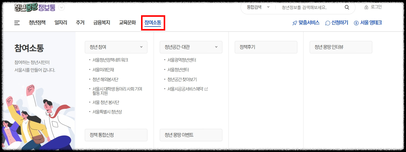 위 화면은 청년몽땅정보통 메인 화면입니다 왼쪽 상단에 보면...