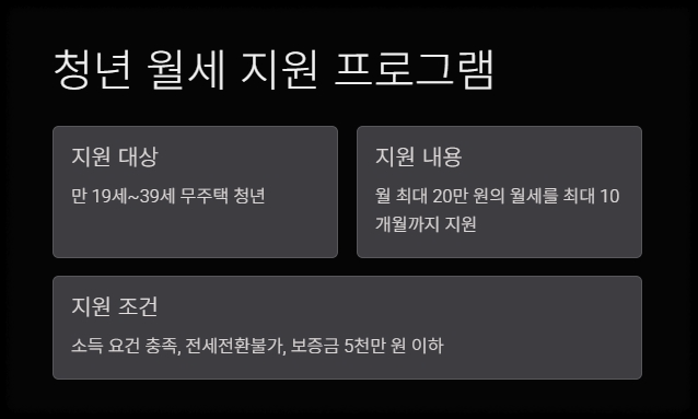 만 19세~39세 무주택 청년을 대상으로 월 최대 20만 원의 월세를 최대 10개월까지 지원합니다. 소득 요건을 충족해야 하며, 전세전환불가, 보증금 5천만 원 이하 등의 조건이 있습니다.