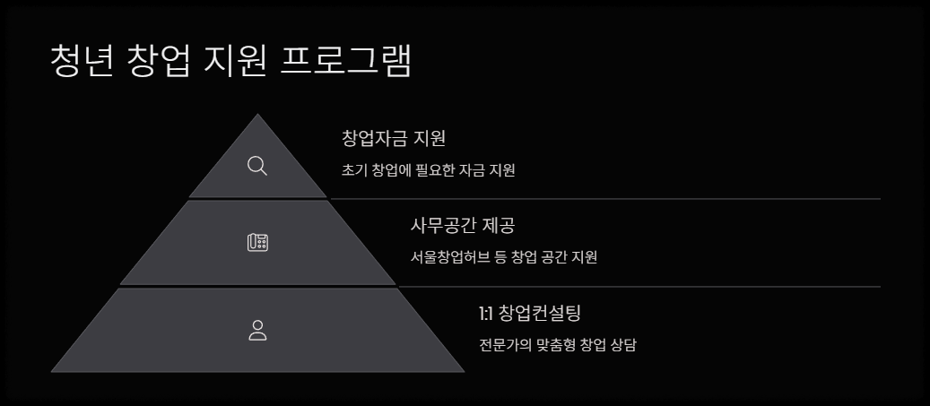 서울창업허브를 비롯한 청년 창업센터에서 창업자금 지원, 사무공간 제공, 1:1 창업컨설팅 등 초기 창업자를 위한 다층적 지원이 이루어집니다. 예비창업패키지와 연계되는 경우도 있습니다.