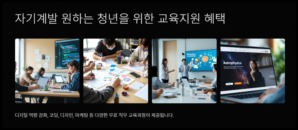 취업과 창업 말고도 자기계발을 위한 교육지원 혜택도 정말 많아요. 저는 작년에 '청년 디지털 역량 강화 교육'을 통해 데이터 분석 과정을 무료로 수강했는데, 정말 큰 도움이 됐어요.