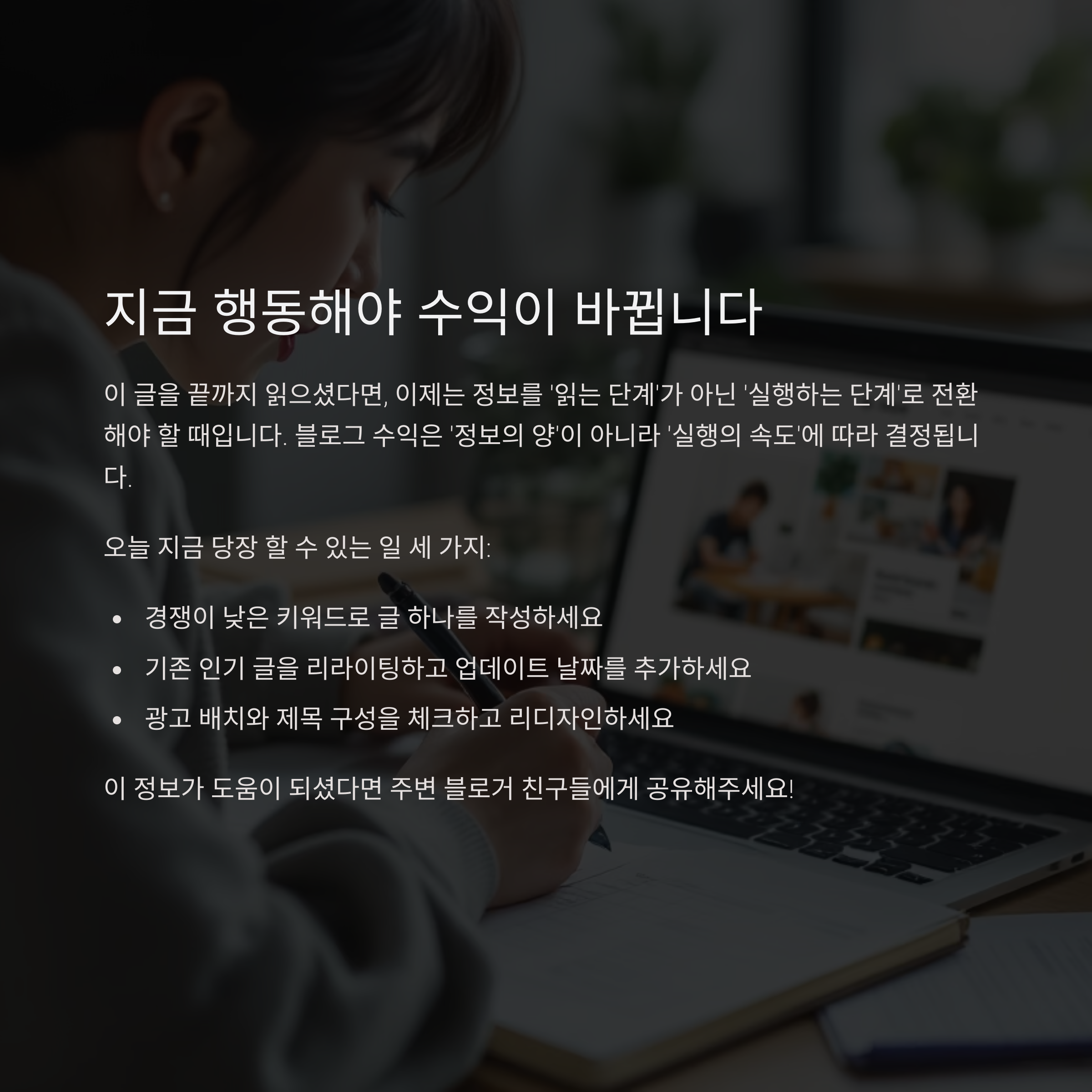 이 글을 끝까지 읽으셨다면, 이제는 정보를 ‘읽는 단계’가 아닌 ‘실행하는 단계’로 전환해야 할 때입니다. 블로그 수익은 ‘정보의 양’이 아니라 ‘실행의 속도’에 따라 결정됩니다.