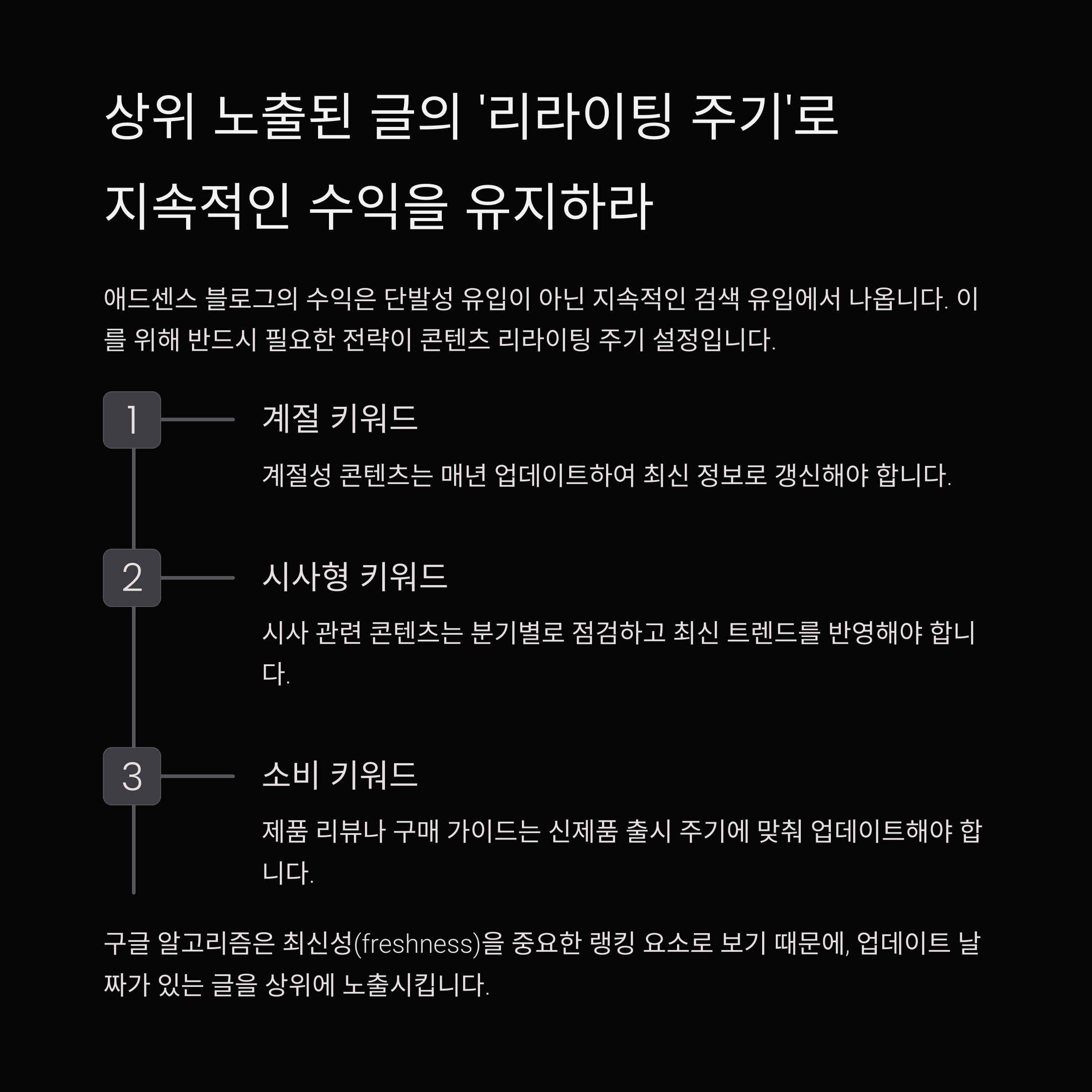 애드센스 블로그의 수익은 단발성 유입이 아닌 지속적인 검색 유입에서 나옵니다. 이를 위해 반드시 필요한 전략이 콘텐츠 리라이팅 주기 설정입니다.