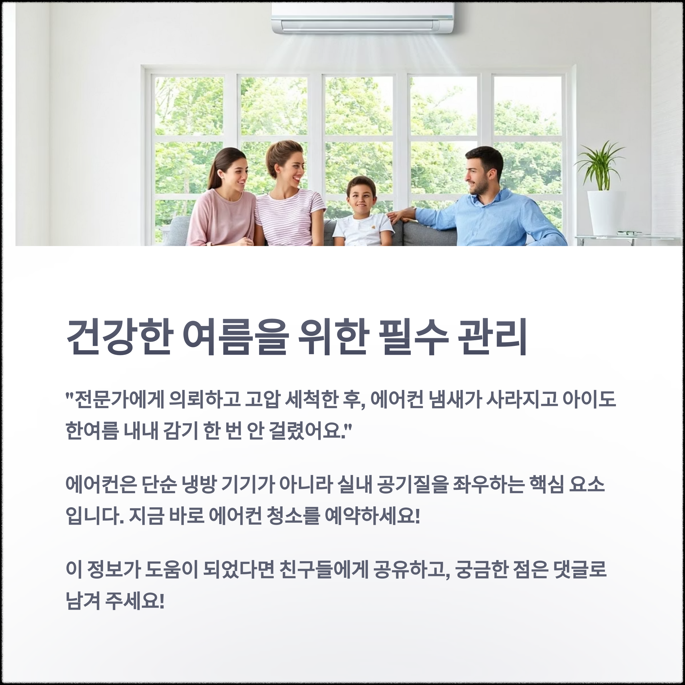 이처럼 에어컨은 단순 냉방 기기가 아니라 실내 공기질을 좌우하는 핵심 요소입니다.