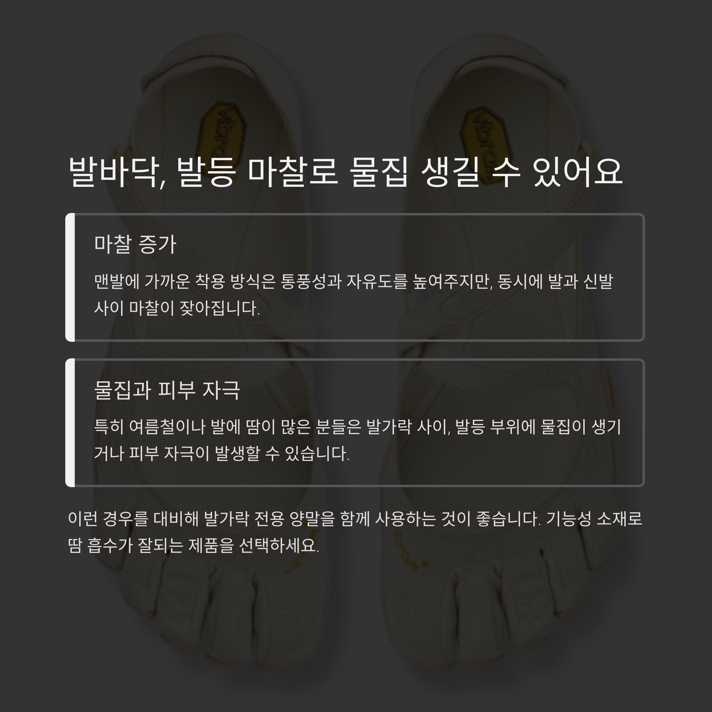 맨발에 가까운 착용 방식은 통풍성과 자유도를 높여주지만, 동시에 발과 신발 사이 마찰이 잦아진다는 뜻이기도 합니다. 특히 여름철이나 발에 땀이 많은 분들은 발가락 사이, 발등 부위에 물집이 생기거나 피부 자극이 발생할 수 있습니다.