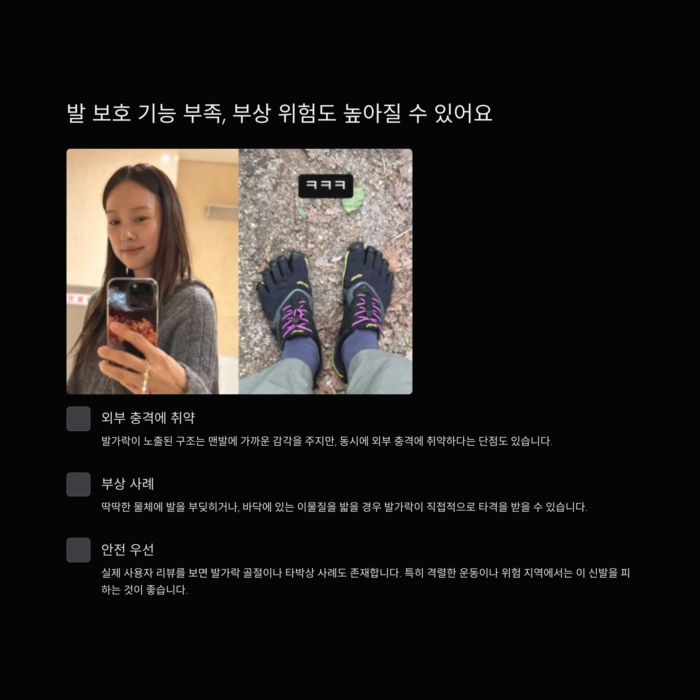 실제 사용자 리뷰를 보면 발가락 골절이나 타박상 사례도 존재합니다. 특히 격렬한 운동이나 위험 지역에서는 이 신발을 피하는 것이 좋습니다. 스타일도 중요하지만, 안전이 우선이라는 점을 잊지 마세요.