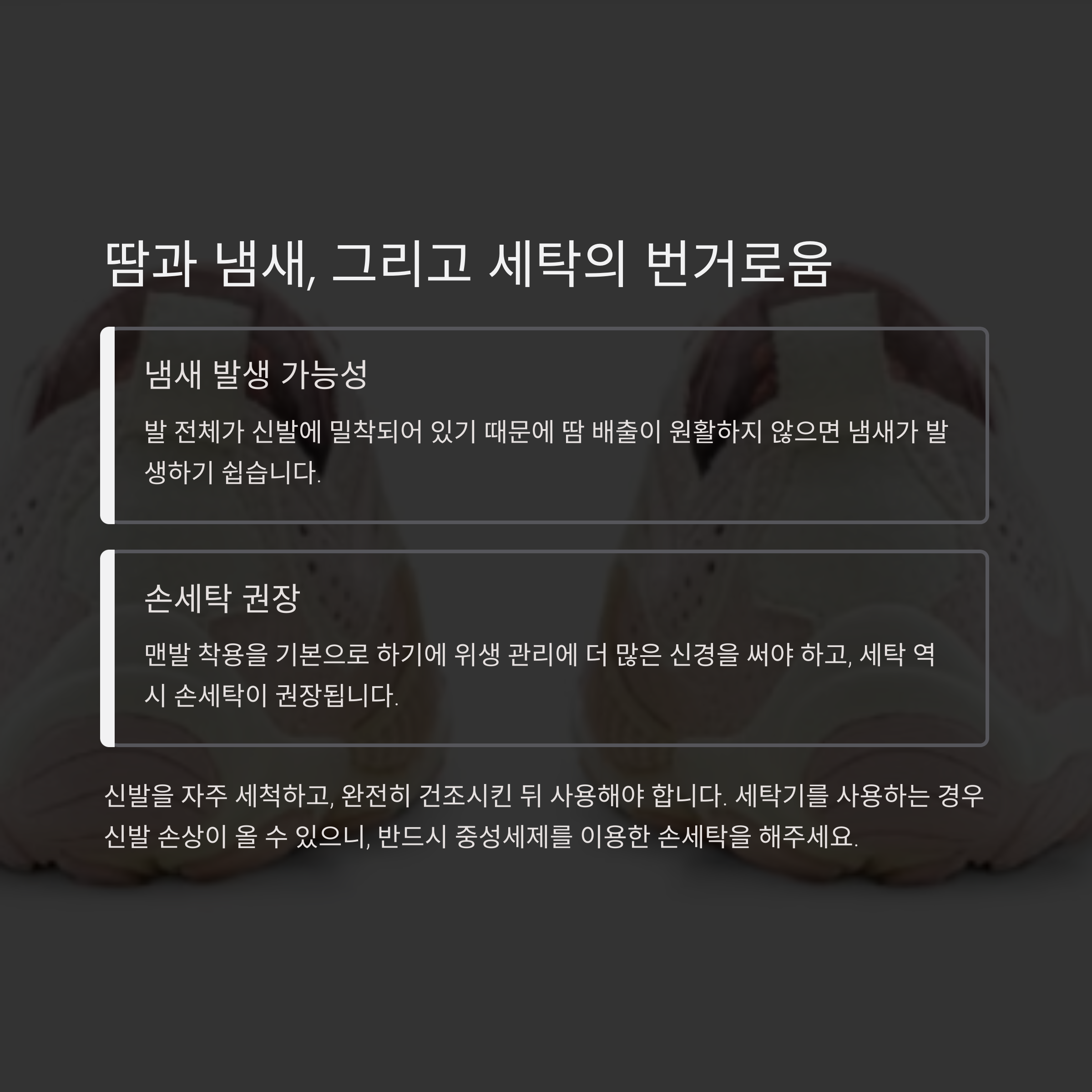 신발을 자주 세척하고, 완전히 건조시킨 뒤 사용해야 합니다. 세탁기를 사용하는 경우 신발 손상이 올 수 있으니, 반드시 중성세제를 이용한 손세탁을 해주세요. 귀찮게 느껴질 수 있지만, 이런 관리가 오래 신을 수 있는 방법입니다. 지금 세탁법을 영상으로 확인해보고, 관리가 가능하겠는지 판단해보세요.