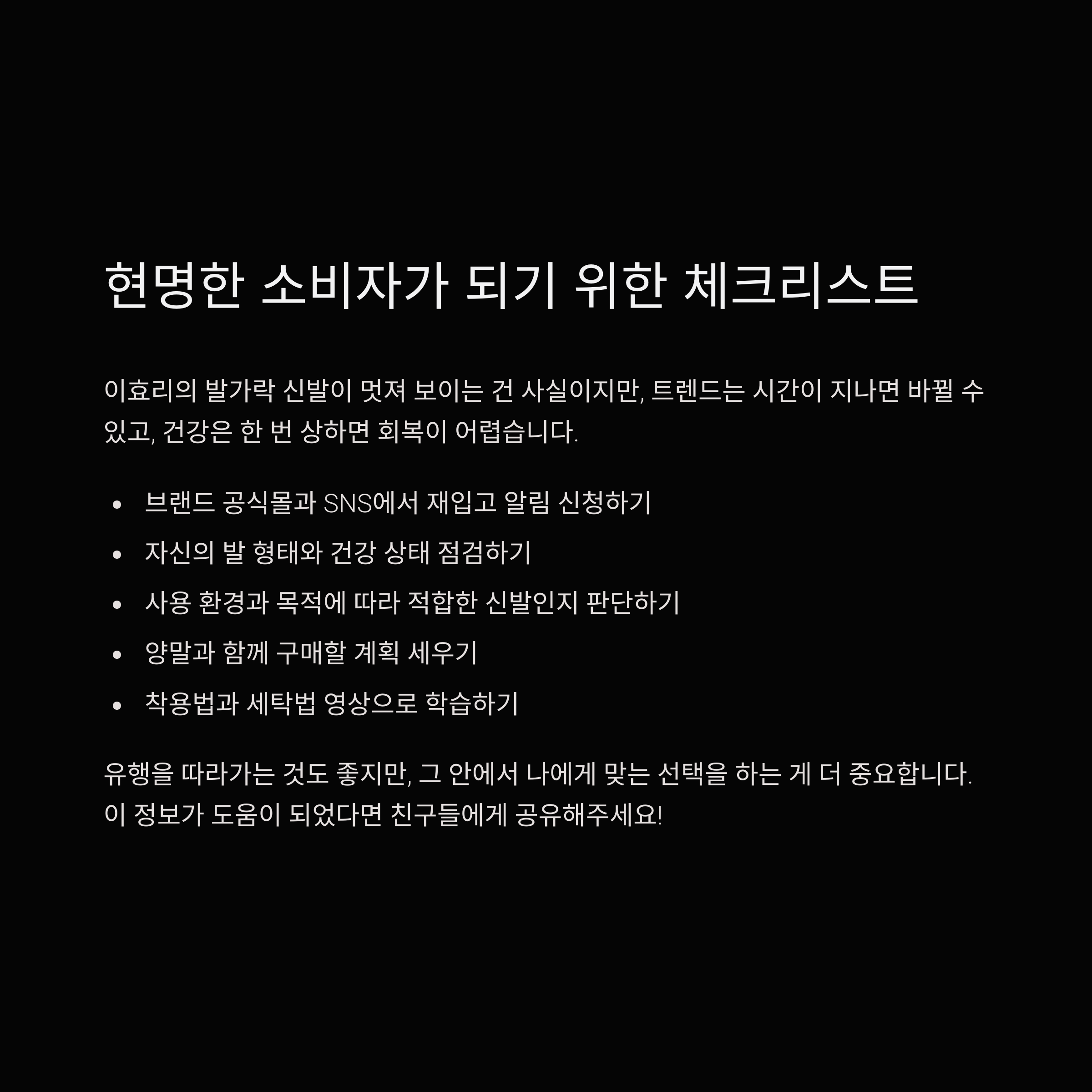 이런 이유로 ‘지금 사야 해?’라는 질문보다는 ‘내 발에 맞는 신발일까?’라는 고민이 선행되어야 합니다.