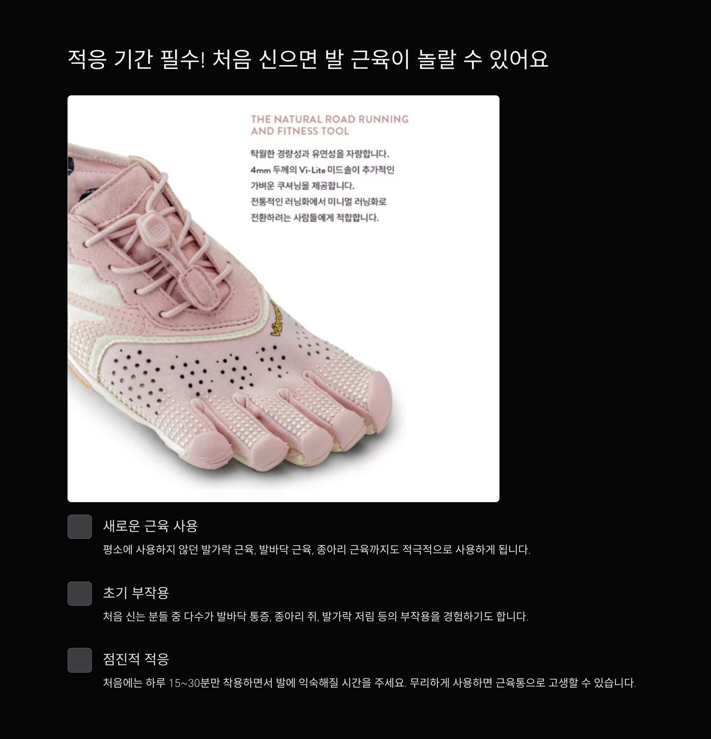 적응 기간 필수! 처음 신으면 발 근육이 놀랄 수 있어요