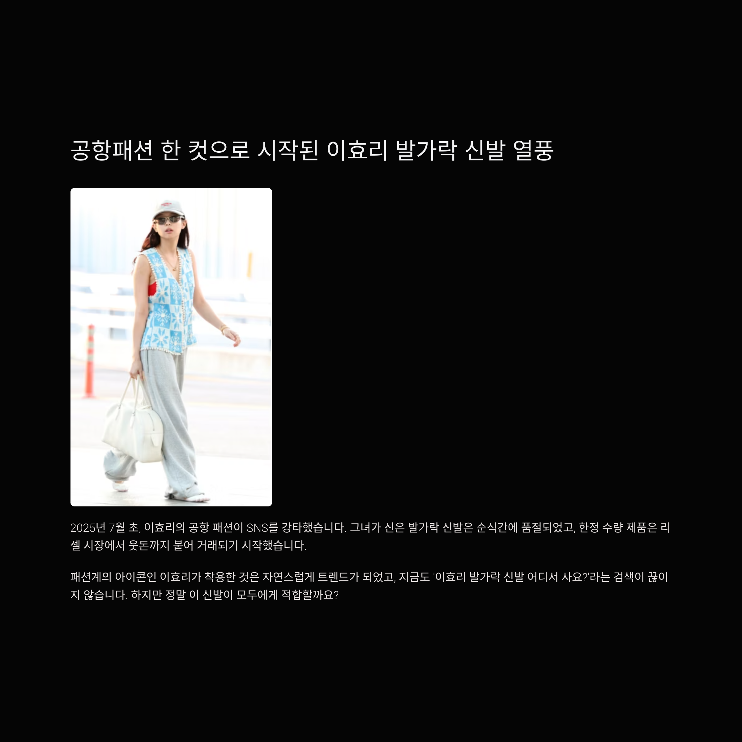 2025년 7월 초, 이효리가 공항에서 착용한 발가락 신발이 SNS를 중심으로 급속도로 퍼졌습니다. 그 순간부터 브랜드 검색량이 폭등했고, 온라인몰은 품절 행진을 이어가며 결국 한정 수량 제품은 리셀 시장에서 웃돈까지 붙어 거래되기 시작했습니다.
