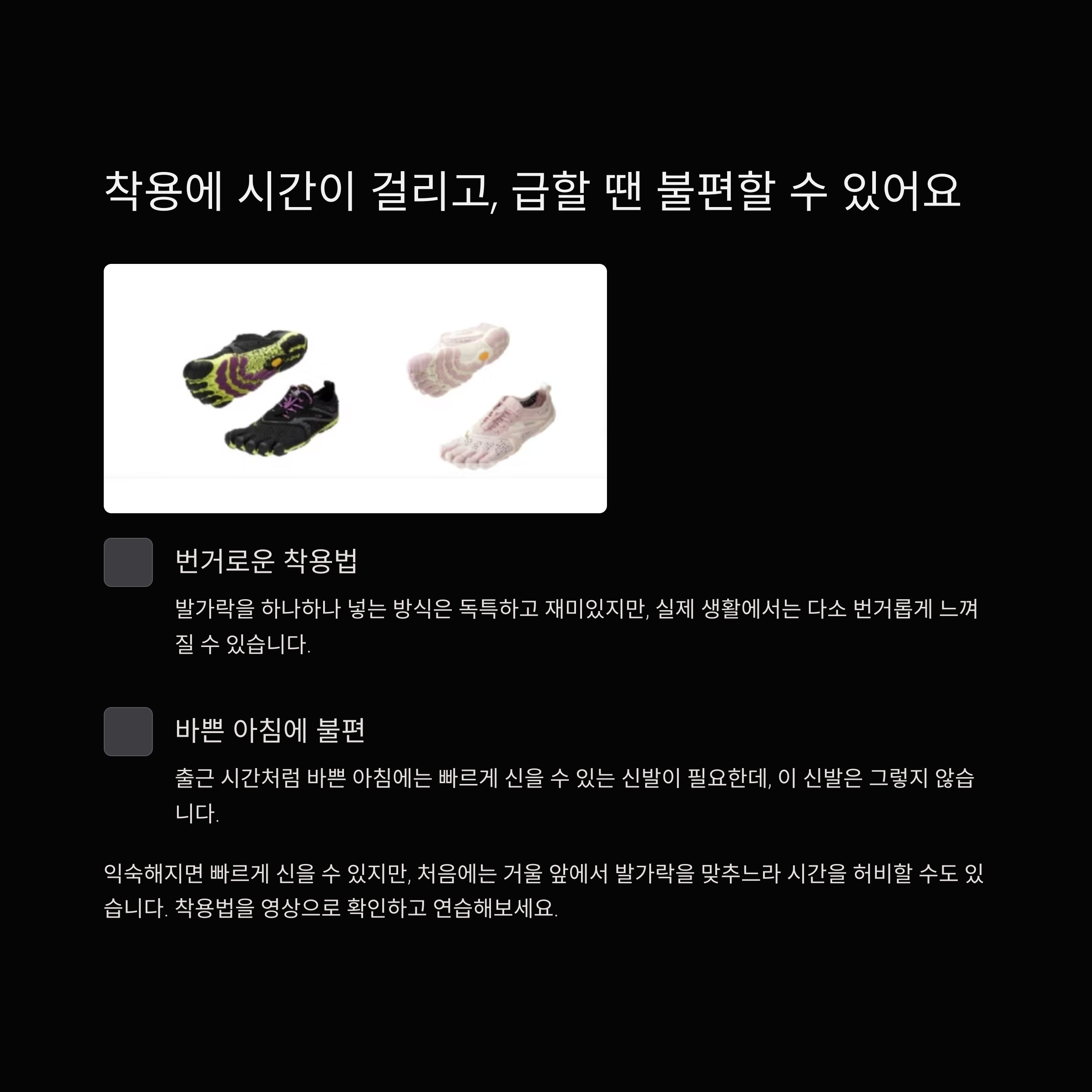 발가락을 하나하나 넣는 방식은 분명 독특하고 재미있습니다. 그러나 실제 생활에서는 다소 번거롭게 느껴질 수 있습니다. 특히 출근 시간처럼 바쁜 아침에는 빠르게 신을 수 있는 신발이 필요한데, 이 신발은 그렇지 않습니다.