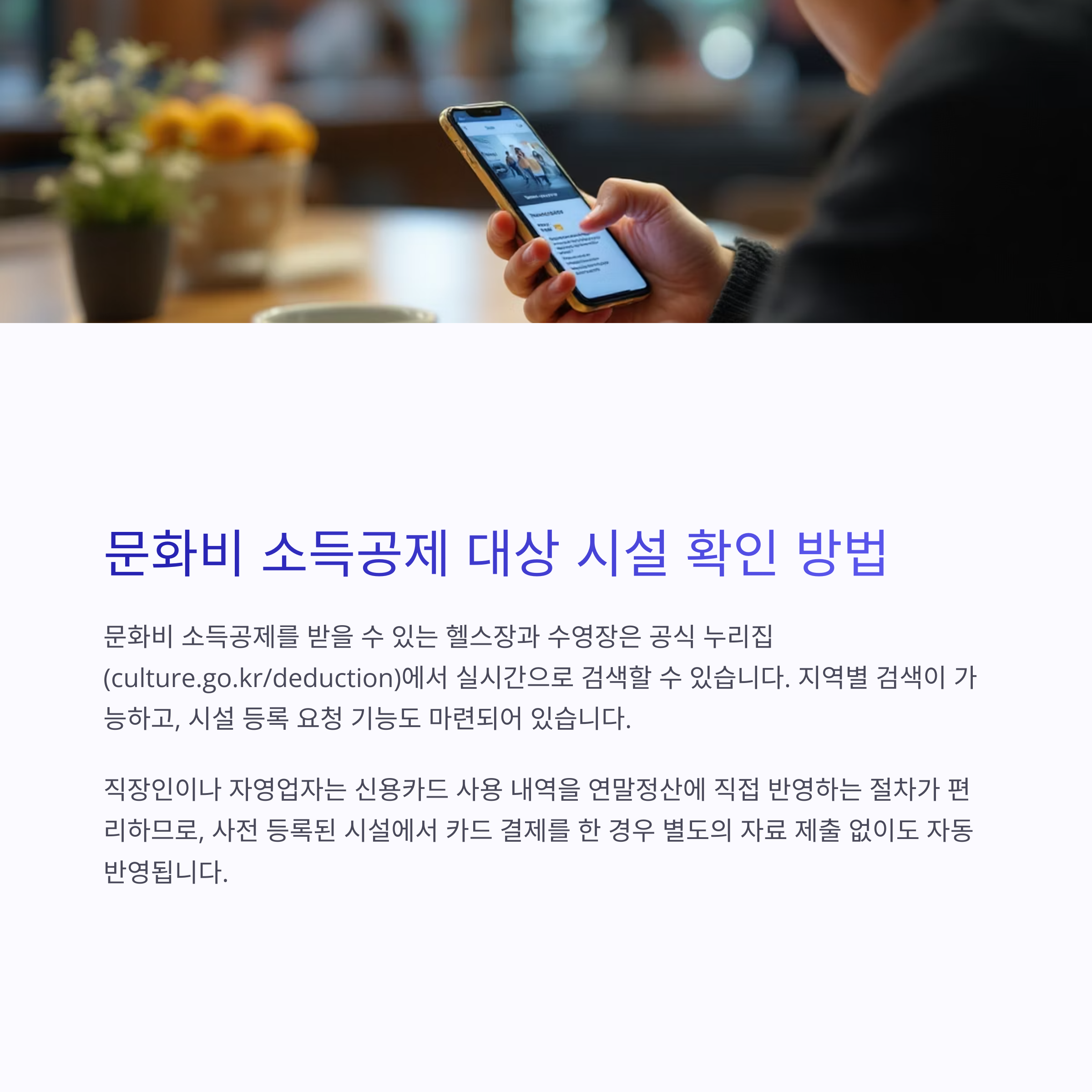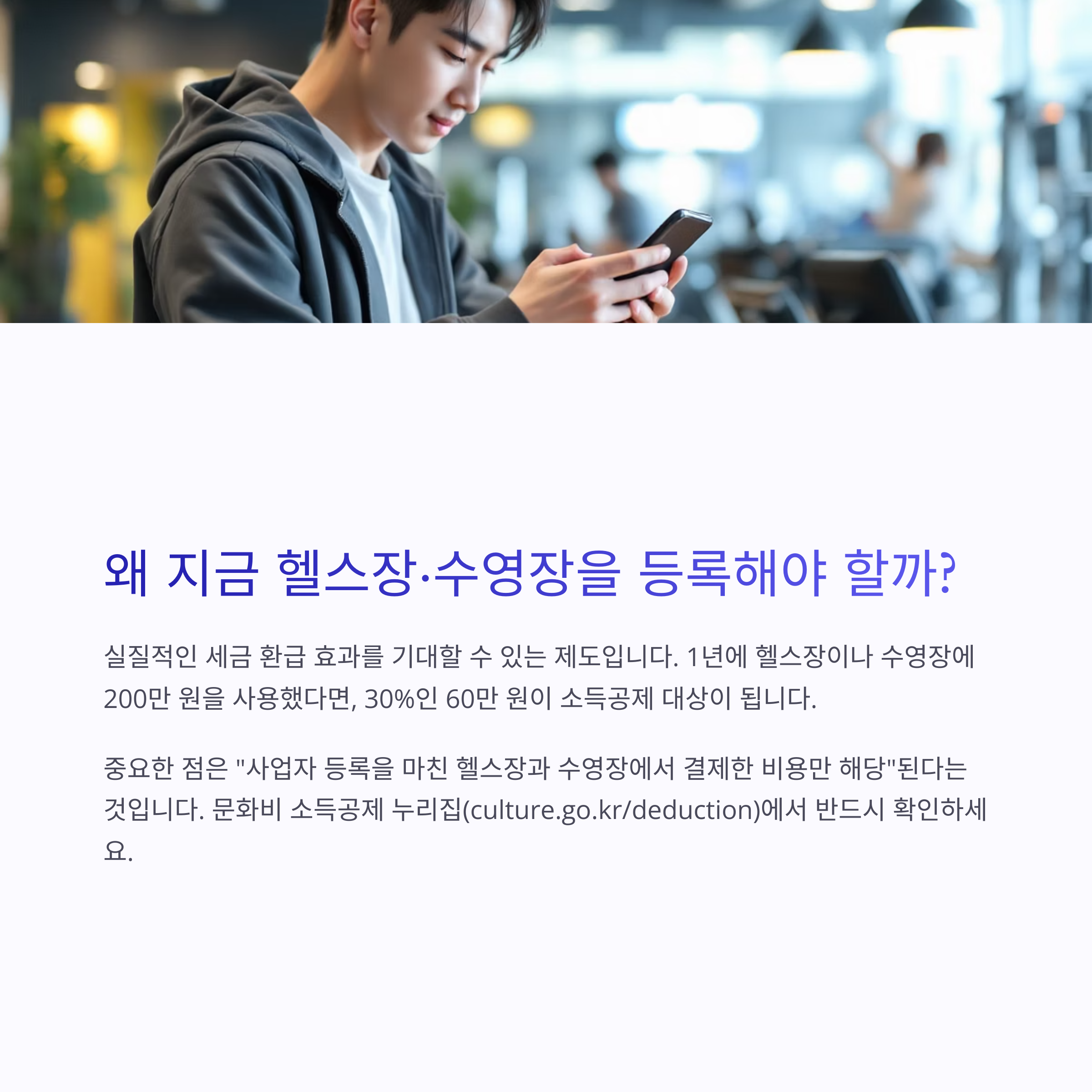 따라서 현재 다니는 헬스장이 이번 제도에 참여하고 있는지, **문화비 소득공제 누리집(culture.go.kr/deduction)**에서 반드시 확인해야 합니다.