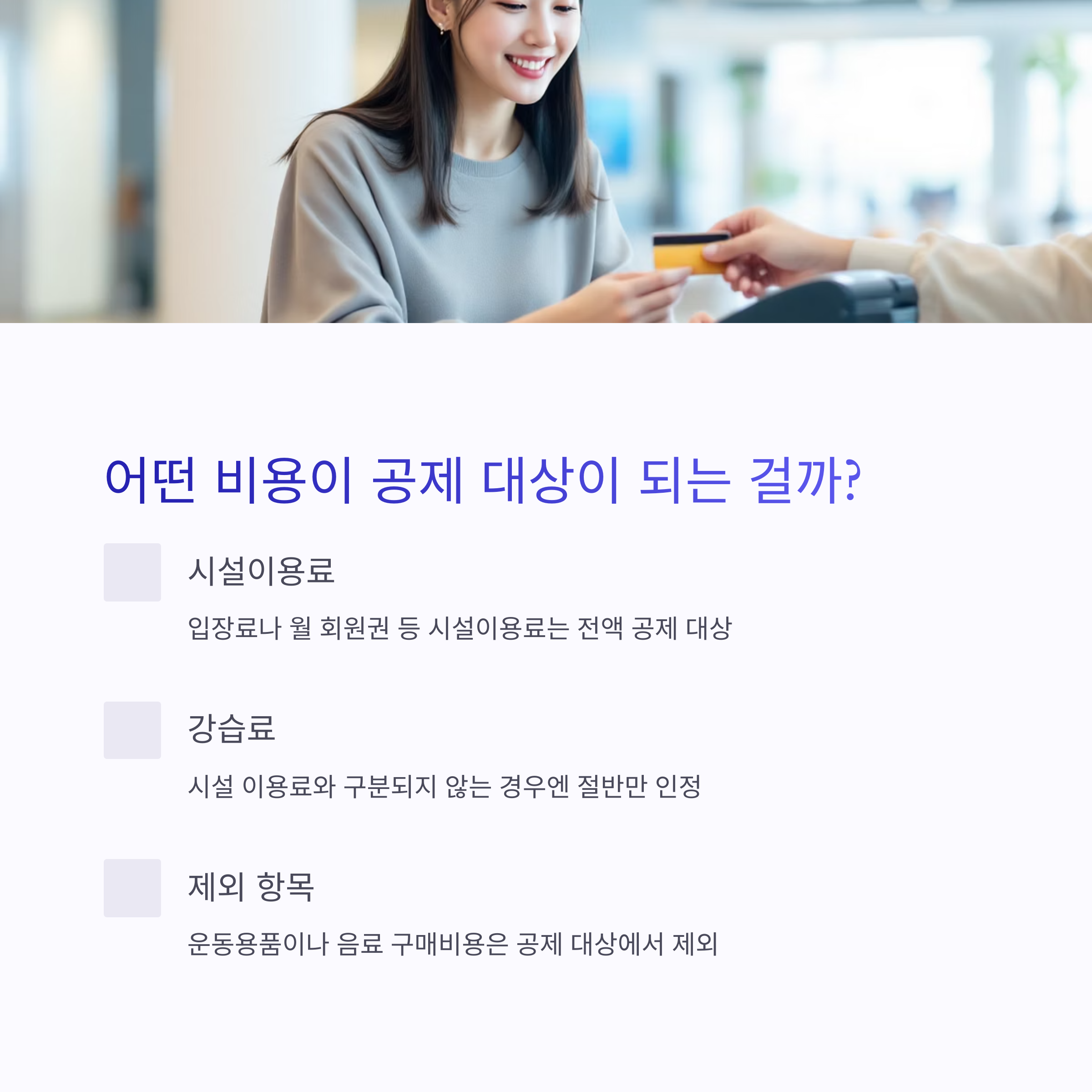 셋째, 운동용품이나 음료 구매비용은 공제 대상에서 제외됩니다. 헬스장에서 물이나 단백질바를 사는 비용은 해당되지 않으니 구분하여 결제하는 것이 중요합니다.