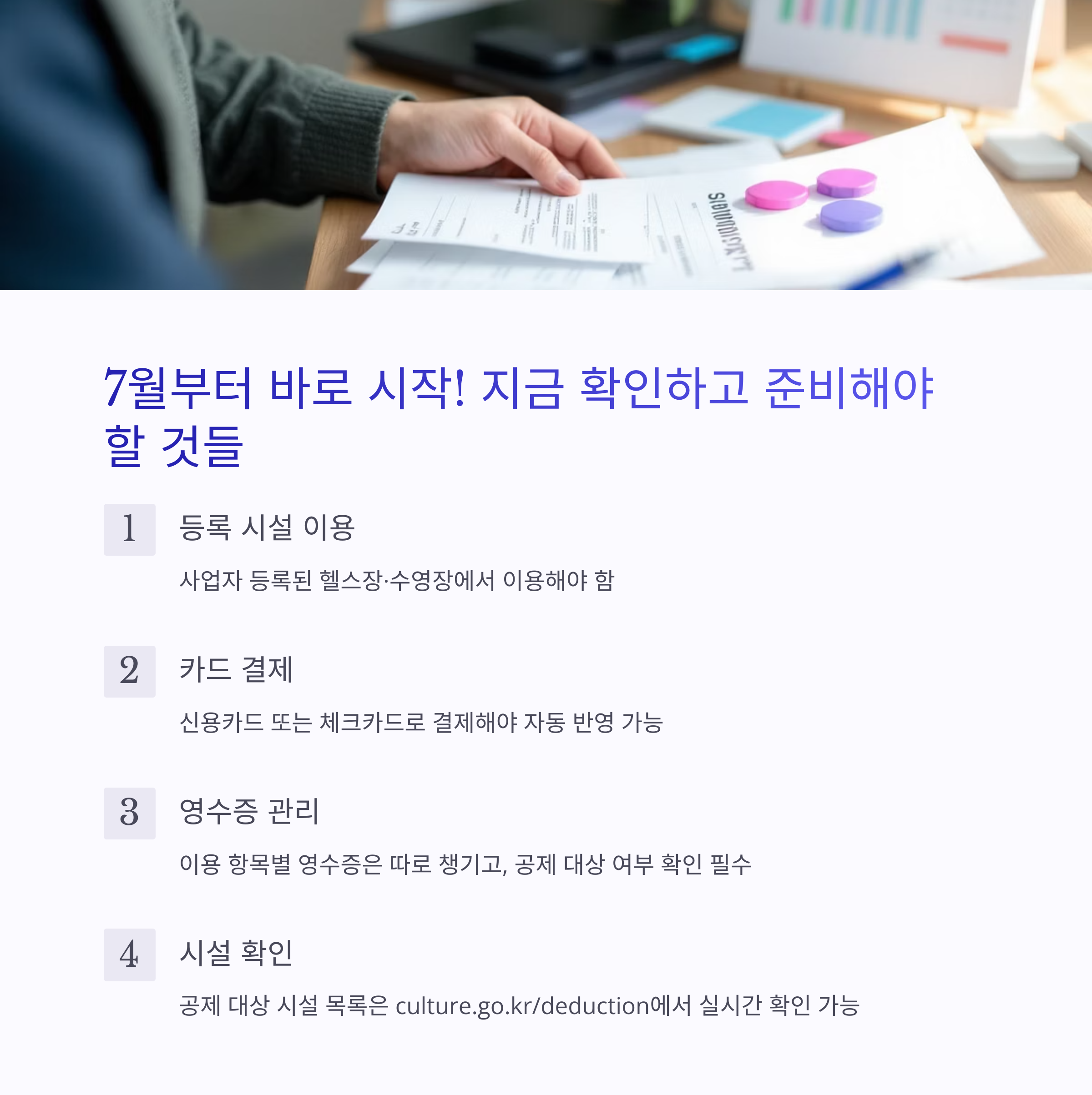 총급여 7000만 원 이하라면 누구나 해당되며, 이미 도서나 공연비로 공제를 받고 있는 사람도 체육시설 비용을 추가로 적용받을 수 있습니다.