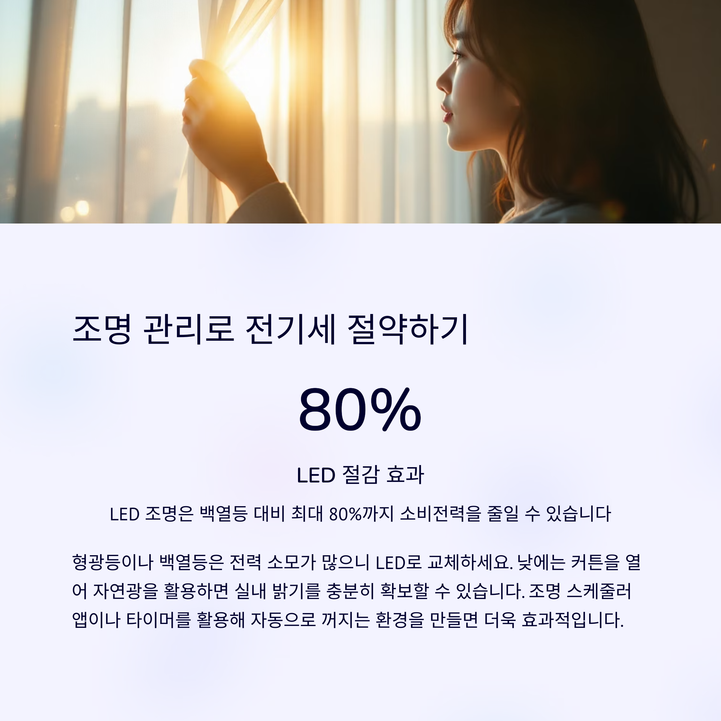 LED 조명은 백열등 대비 최대 80%까지 소비전력을 줄일 수 있어 장기적으로 훨씬 경제적입니다. 또한 낮에는 커튼을 열어 자연광을 활용하면 실내 밝기를 충분히 확보할 수 있습니다.