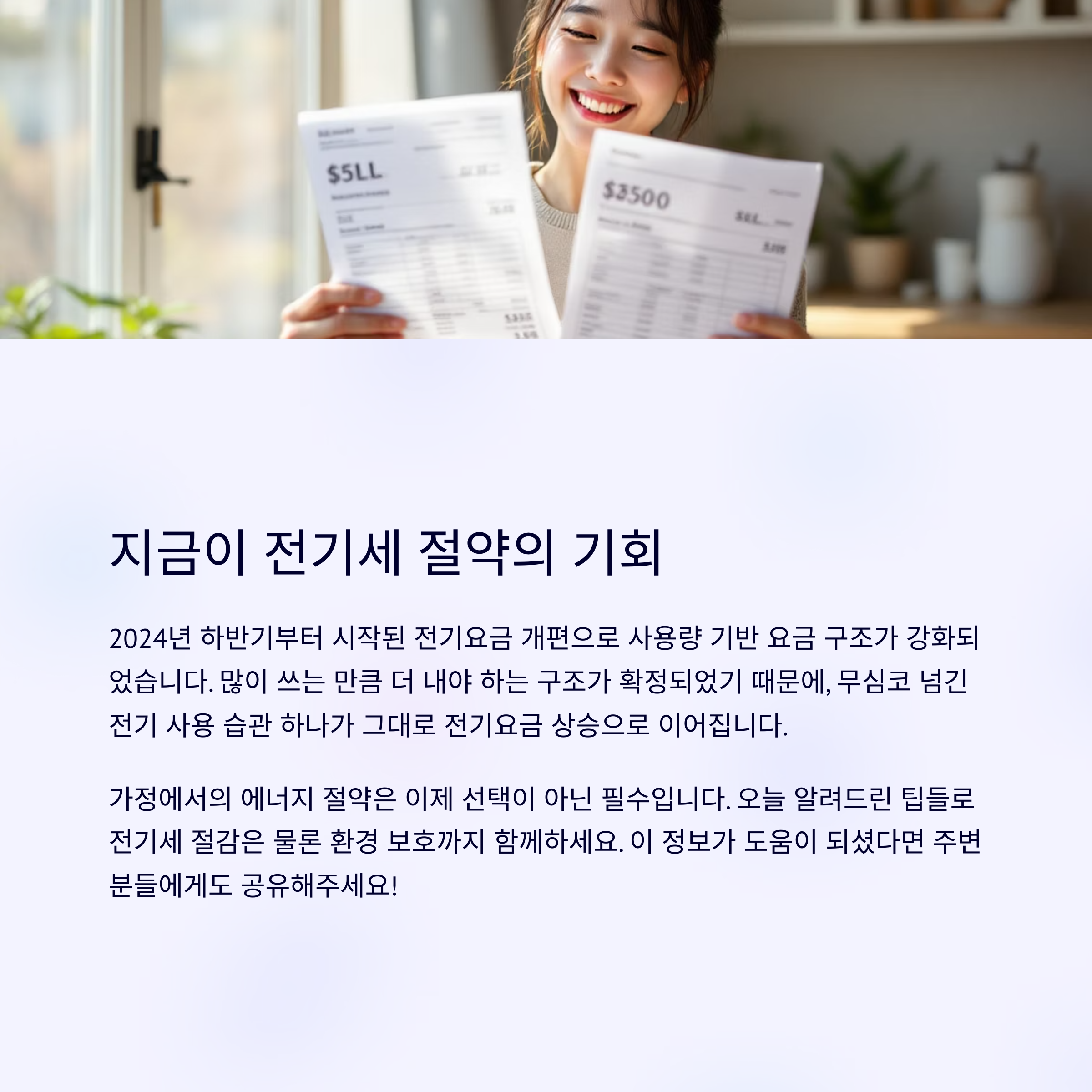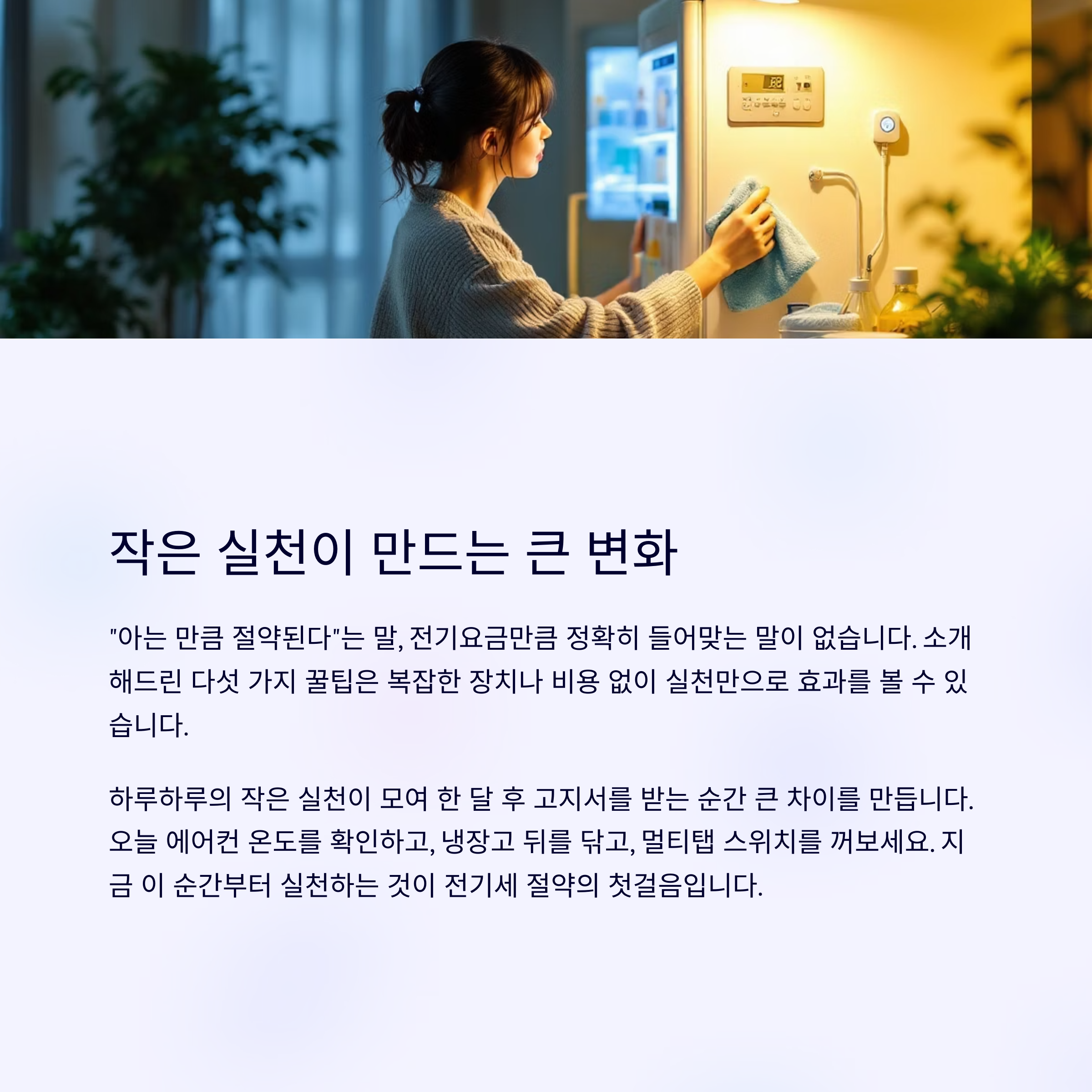 전기요금이 갑자기 확 줄어들진 않더라도, 하루하루의 작은 실천이 모여 한 달 후 고지서를 받는 순간 큰 차이를 만듭니다.