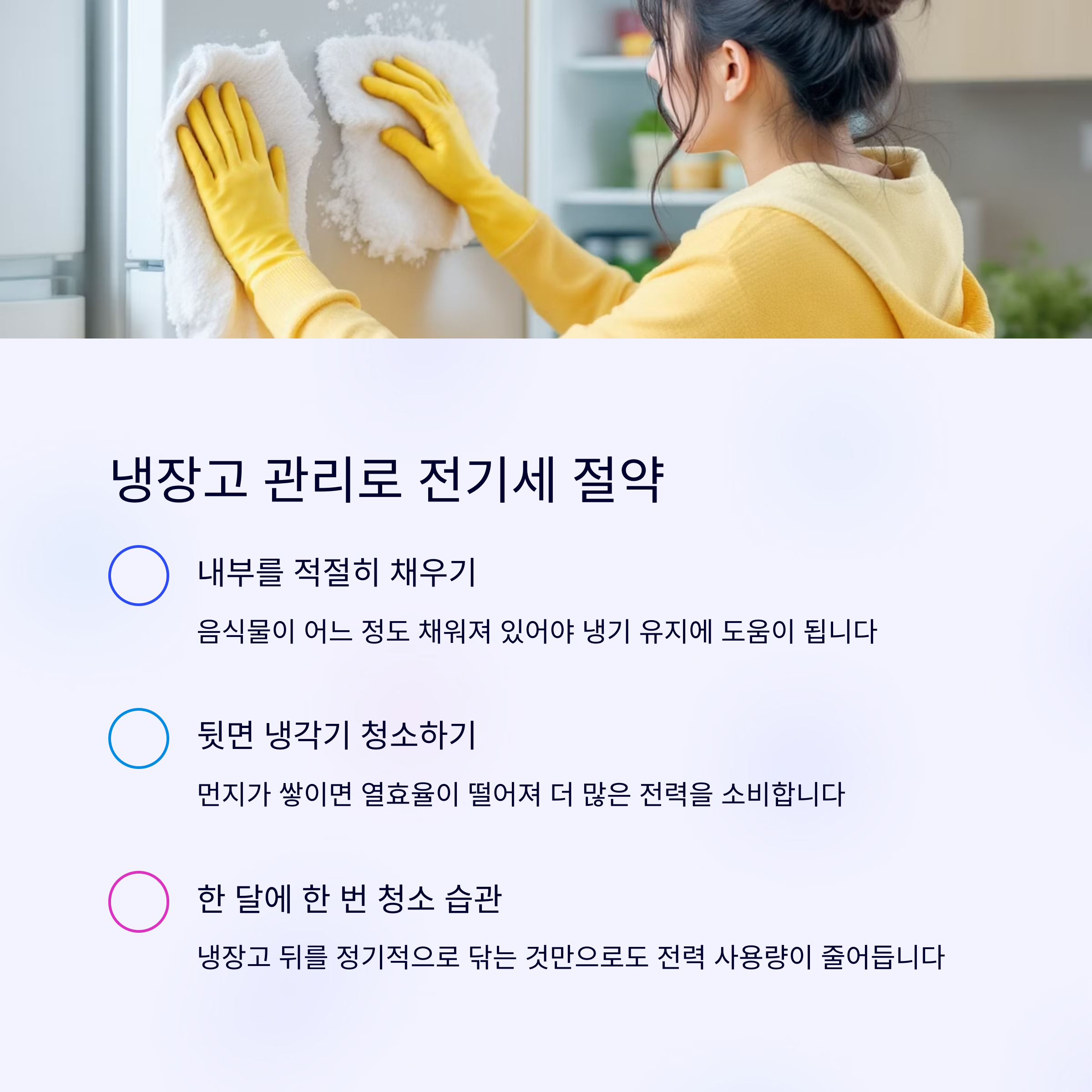 냉장고는 24시간 내내 전력을 사용하는 대표 가전입니다. 전기세 절약을 위해 가장 중요한 점은 두 가지입니다.