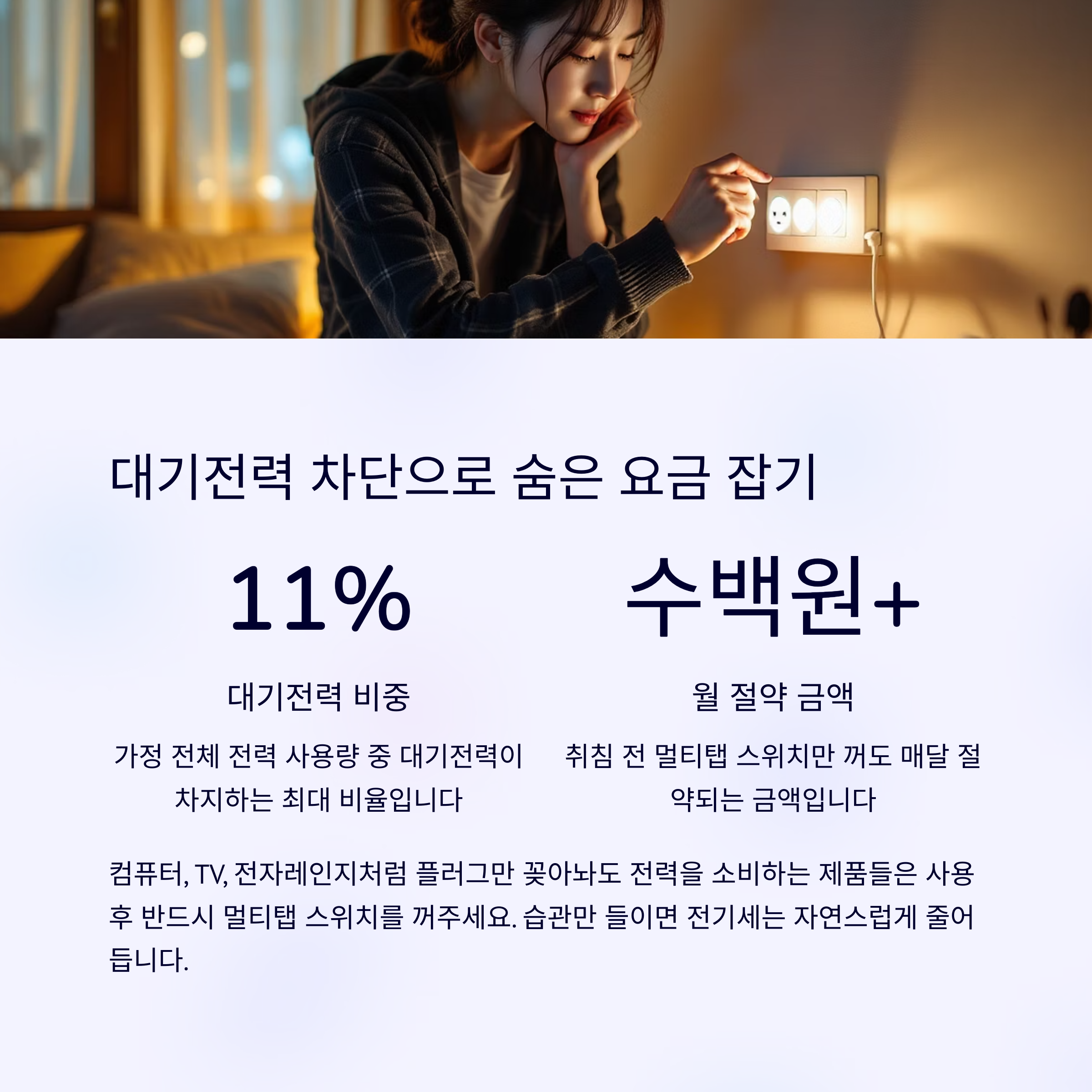 습관만 들이면 전기세는 자연스럽게 줄어듭니다. 오늘 밤부터 멀티탭부터 먼저 확인하세요.