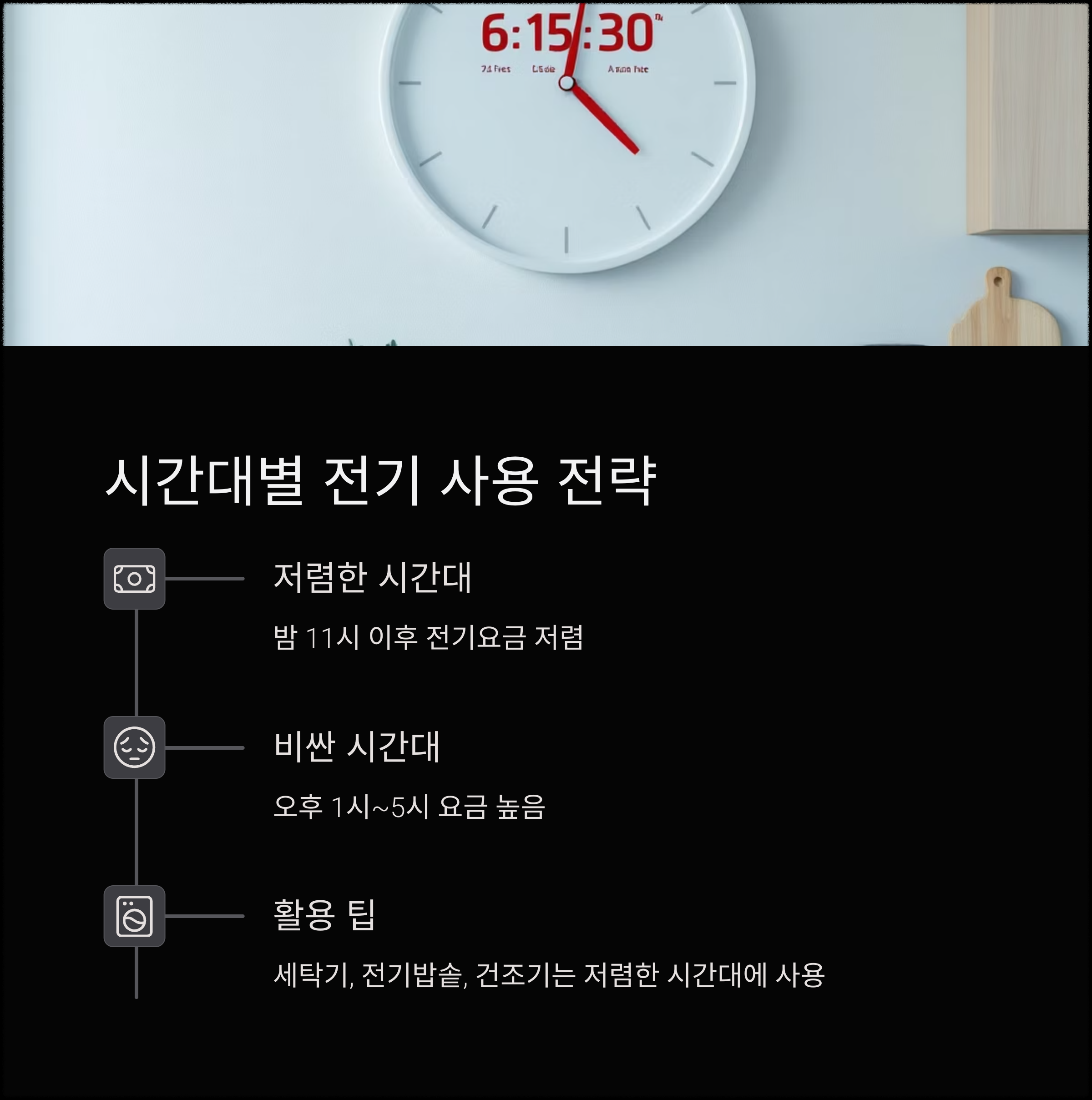 세탁기, 전기밥솥, 건조기 등은 전기료가 저렴한 시간대에 사용하는 것이 유리합니다.
