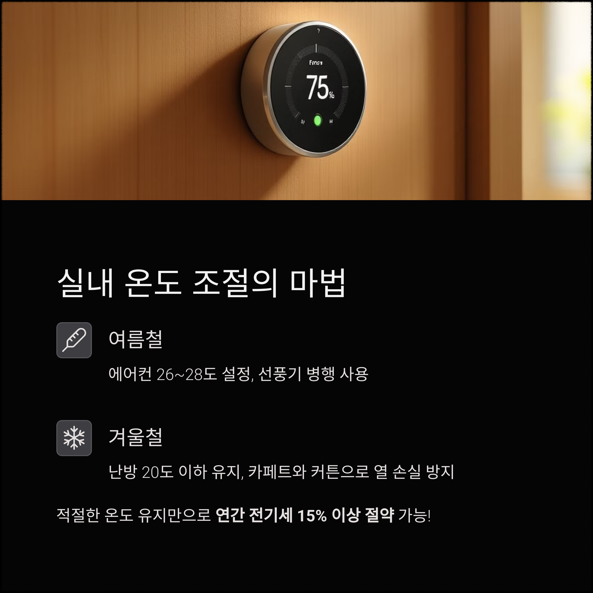 적절한 실내 온도 유지만으로도 연간 전기세의 15% 이상을 줄일 수 있습니다.