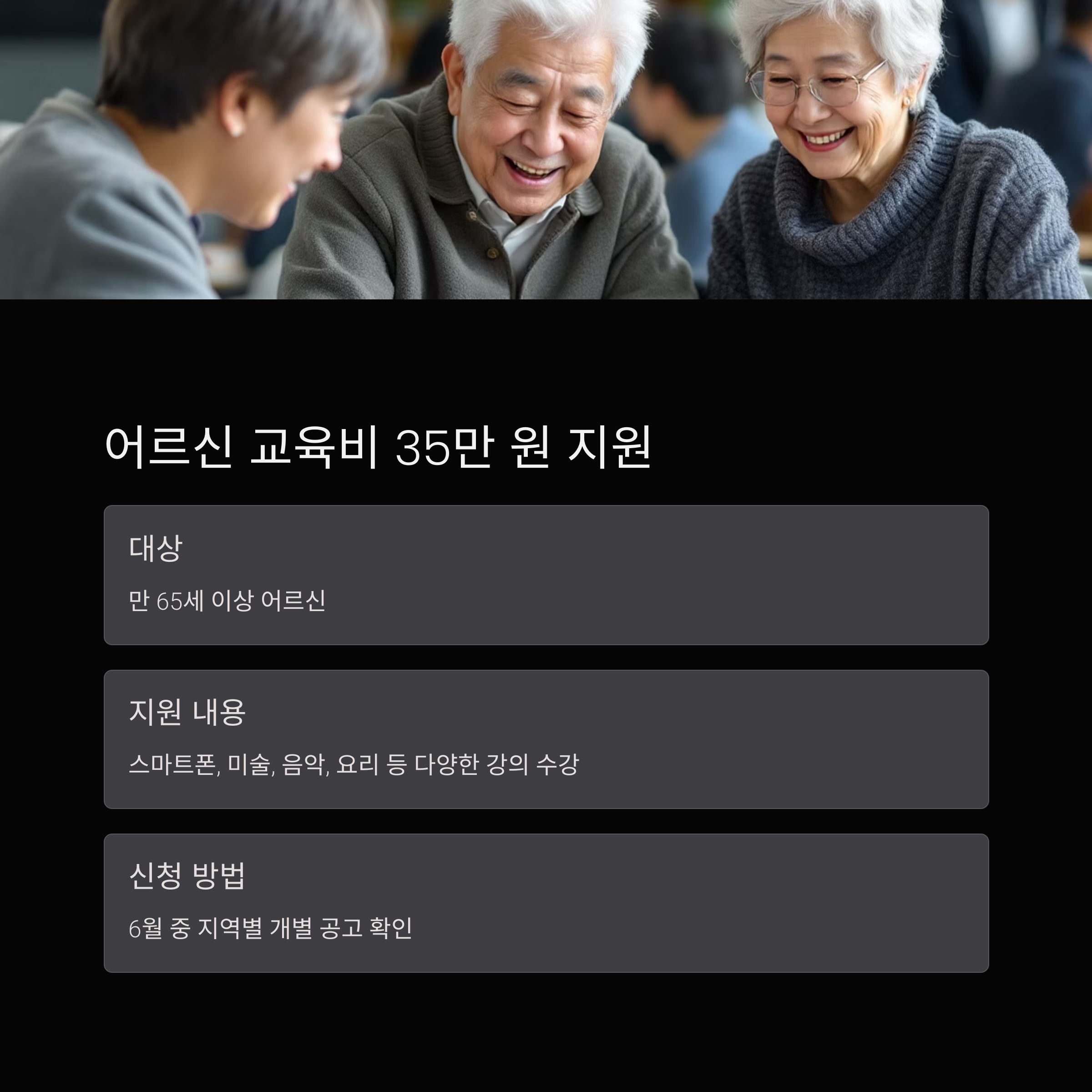 | 노인 평생교육 바우처 | 6월 중 개별 지역 공고 | 1인당 35만 원 | 만 65세 이상 어르신 |