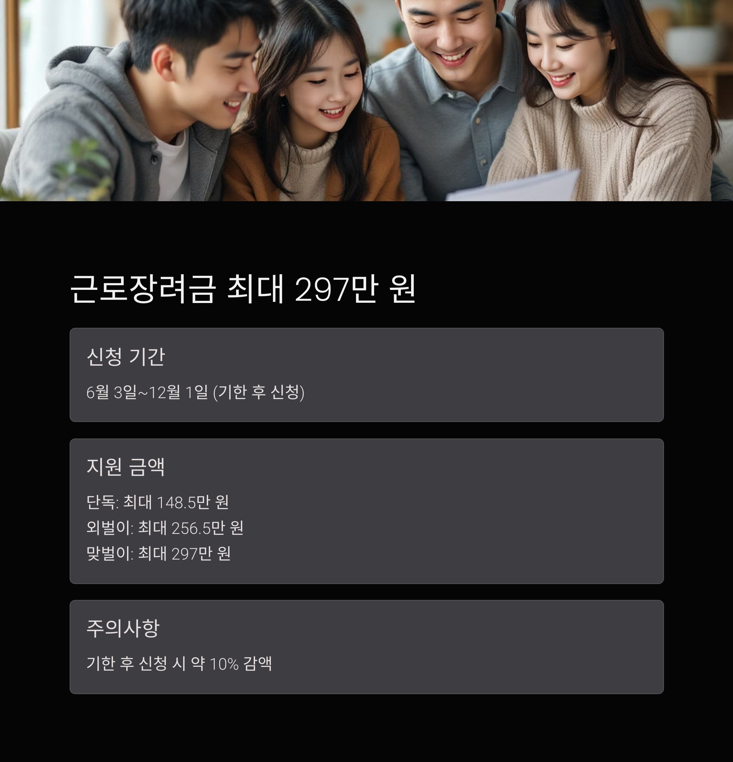 | 근로장려금 | 6.3~12.1 | 최대 297만 원 | 저소득 근로 가구 |