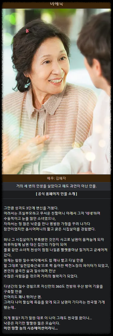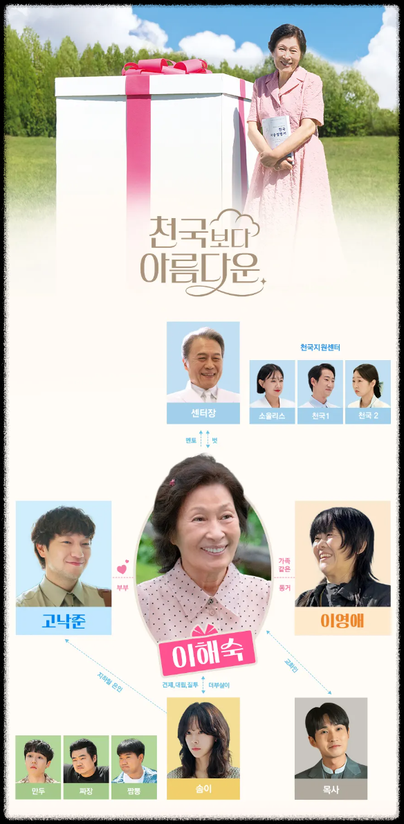 ‘천국보다 아름다운’ 이 드라마는 80세 할머니 이해숙이 세상을 떠나 천국수용상담소에 도착하면서 시작되는데 이곳에서 그녀는 놀라운 선택을 하게 됩니다. 바로 80대의 모습을 그대로 유지한 채 천국에서의 삶을 이어가기로 한 거예요. 그 이유가 참 따뜻한데요. 남편 고낙준이 생전에 "네가 어느 나이에나 예쁘다"고 말해줬던 기억 때문이랍니다.