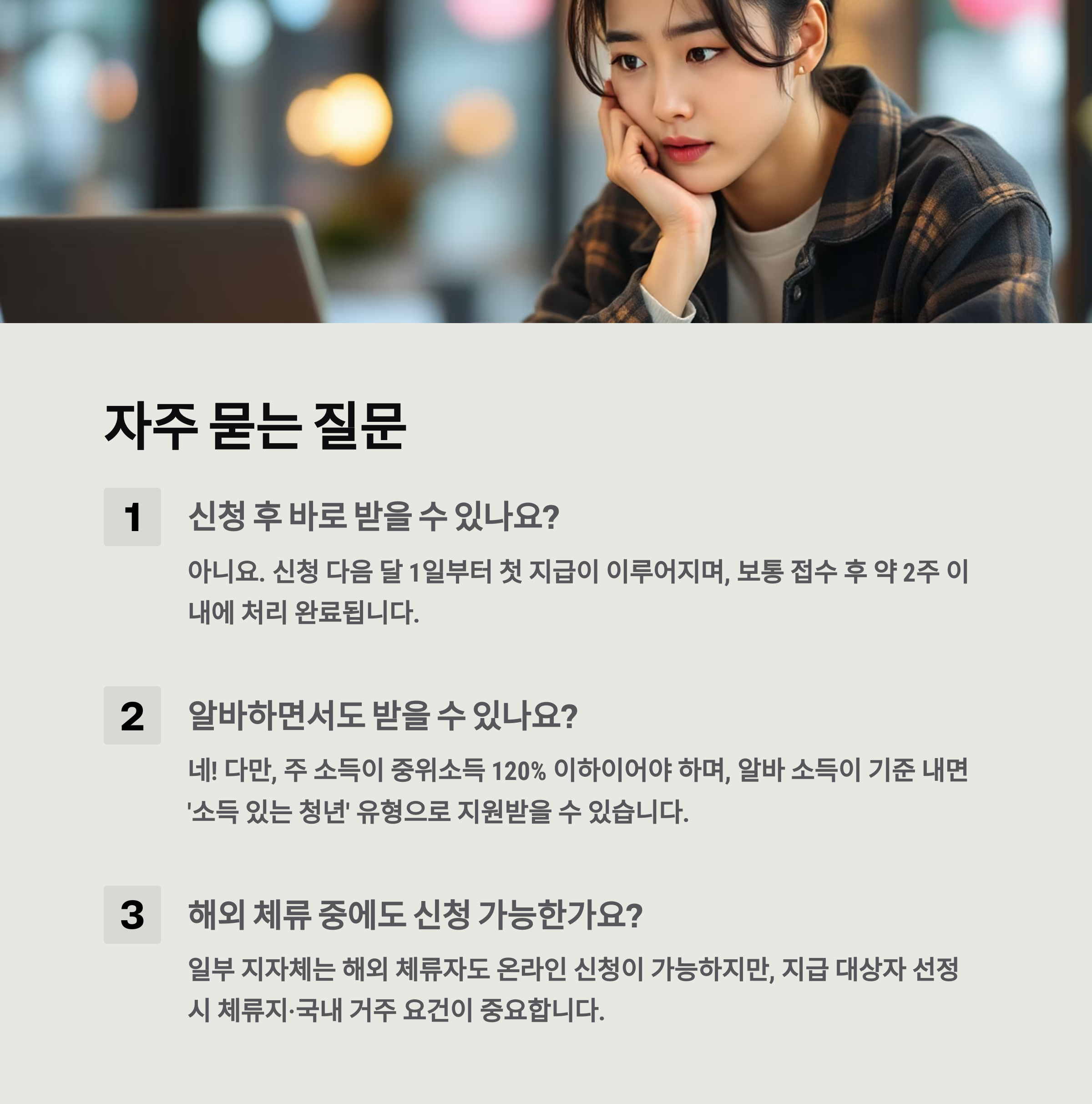 A3. 일부 지자체는 해외 체류자도 온라인 신청이 가능하지만, 지급 대상자 선정 시 체류지·국내 거주 요건이 중요하므로, 신청 전 해당 지자체의 안내를 반드시 확인하세요.