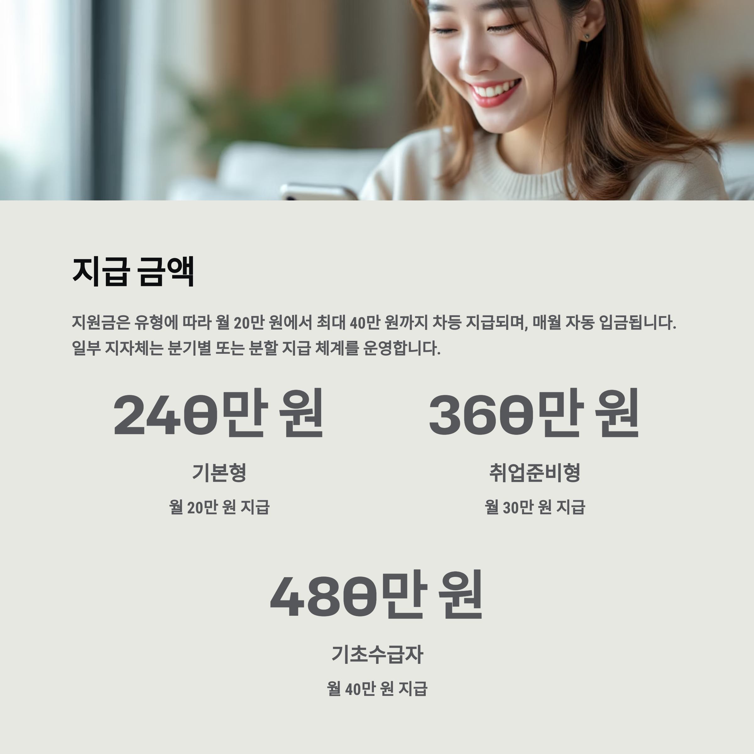 지원금은 유형에 따라 월 20만 원에서 최대 40만 원까지 차등 지급되며, 지급 방식은 매월 자동 입금 방식을 사용합니다. 일부 지자체는 분기별 또는 분할 지급 체계를 운영하기도 합니다.