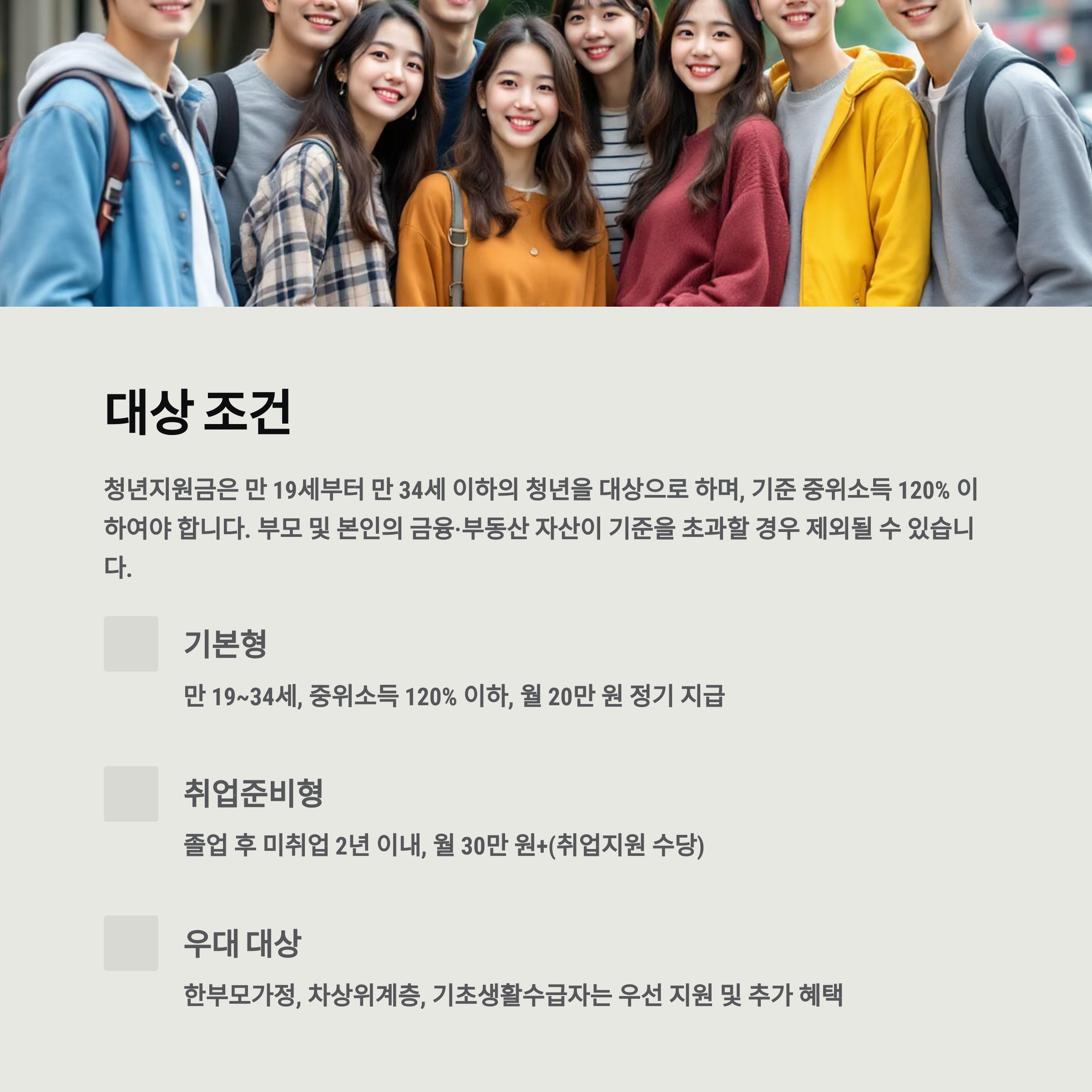 | 기본형 | 만 19~34세, 중위소득 120% 이하 | 월 20만 원 정기 지급 |