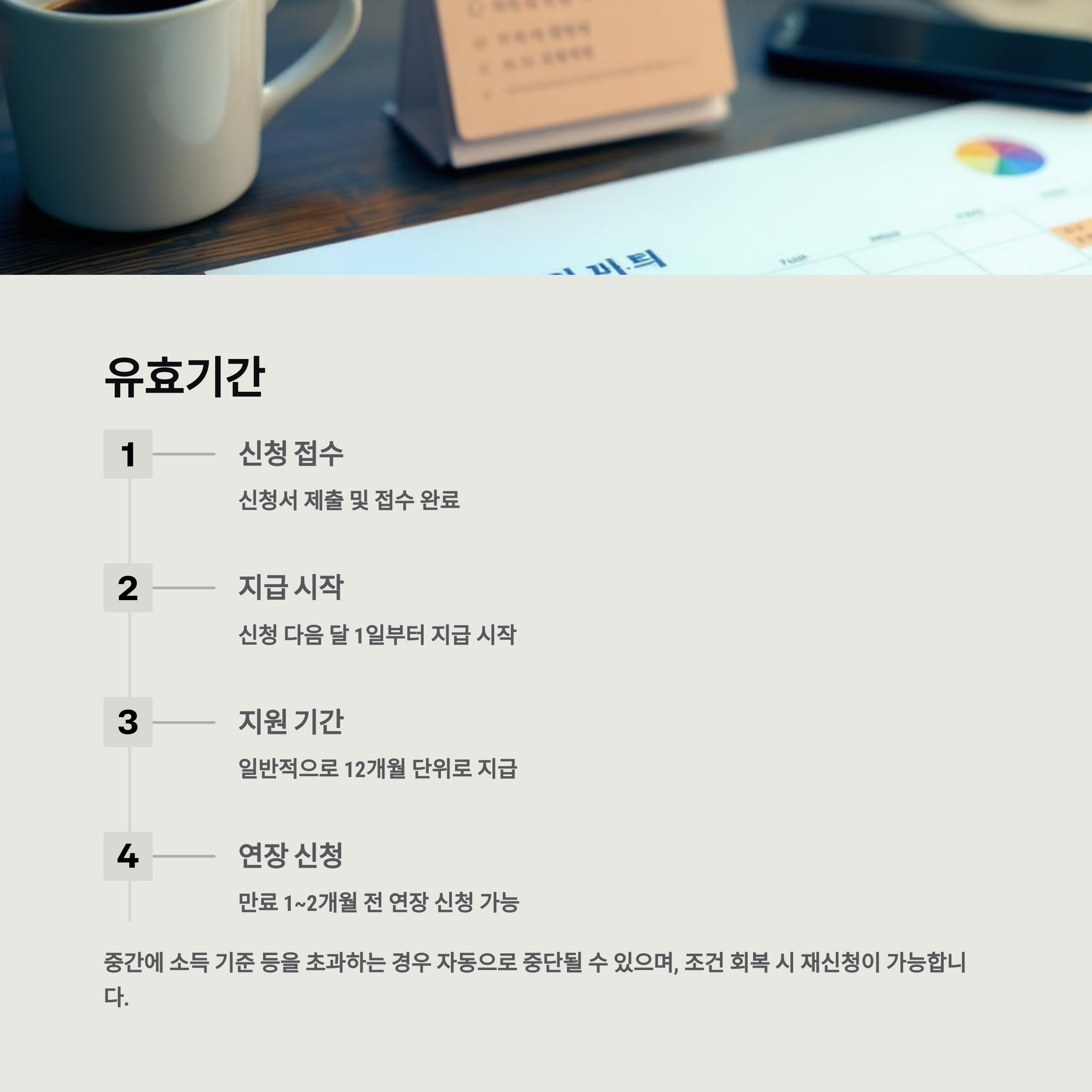 일반적으로 12개월 단위로 지급되며, 중간에 소득 기준 등을 초과하는 경우에는 자동으로 중단될 수 있습니다. 이후 조건 회복 시 재신청이 가능합니다.