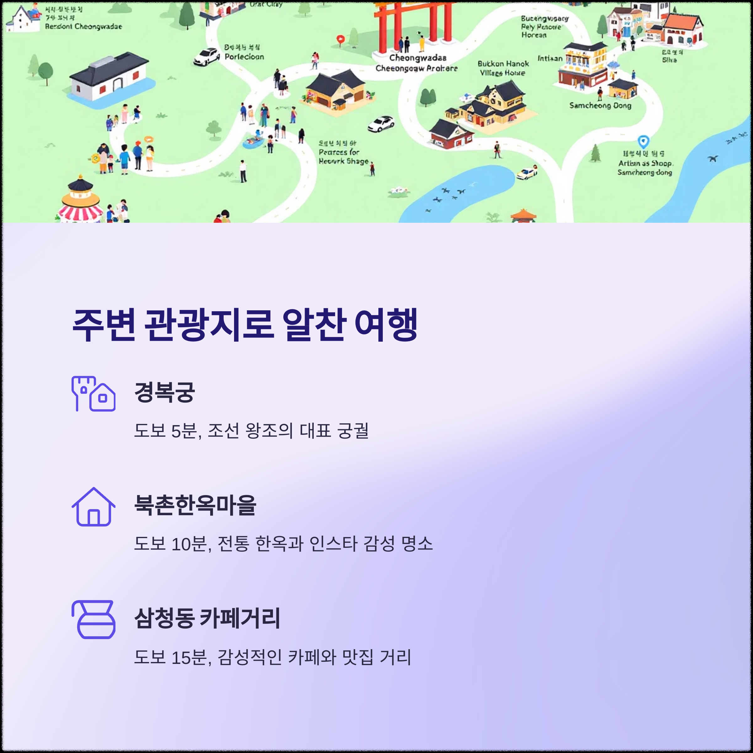 | 북촌한옥마을 | 도보 10분 | 전통 한옥과 인스타 감성 명소 |