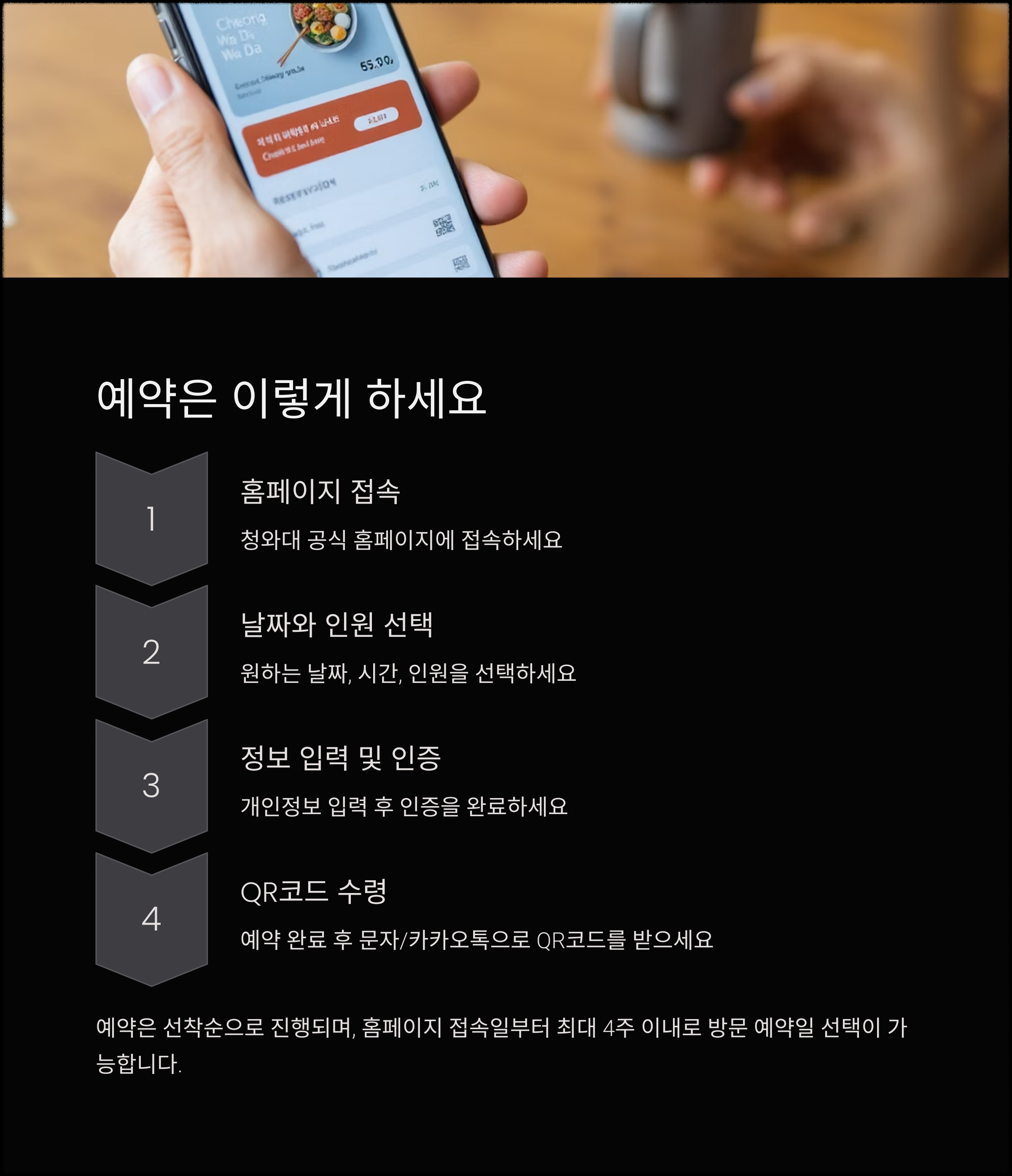 - 입장 시 신분증과 예약 시 받은 QR코드를 지참해야 합니다.