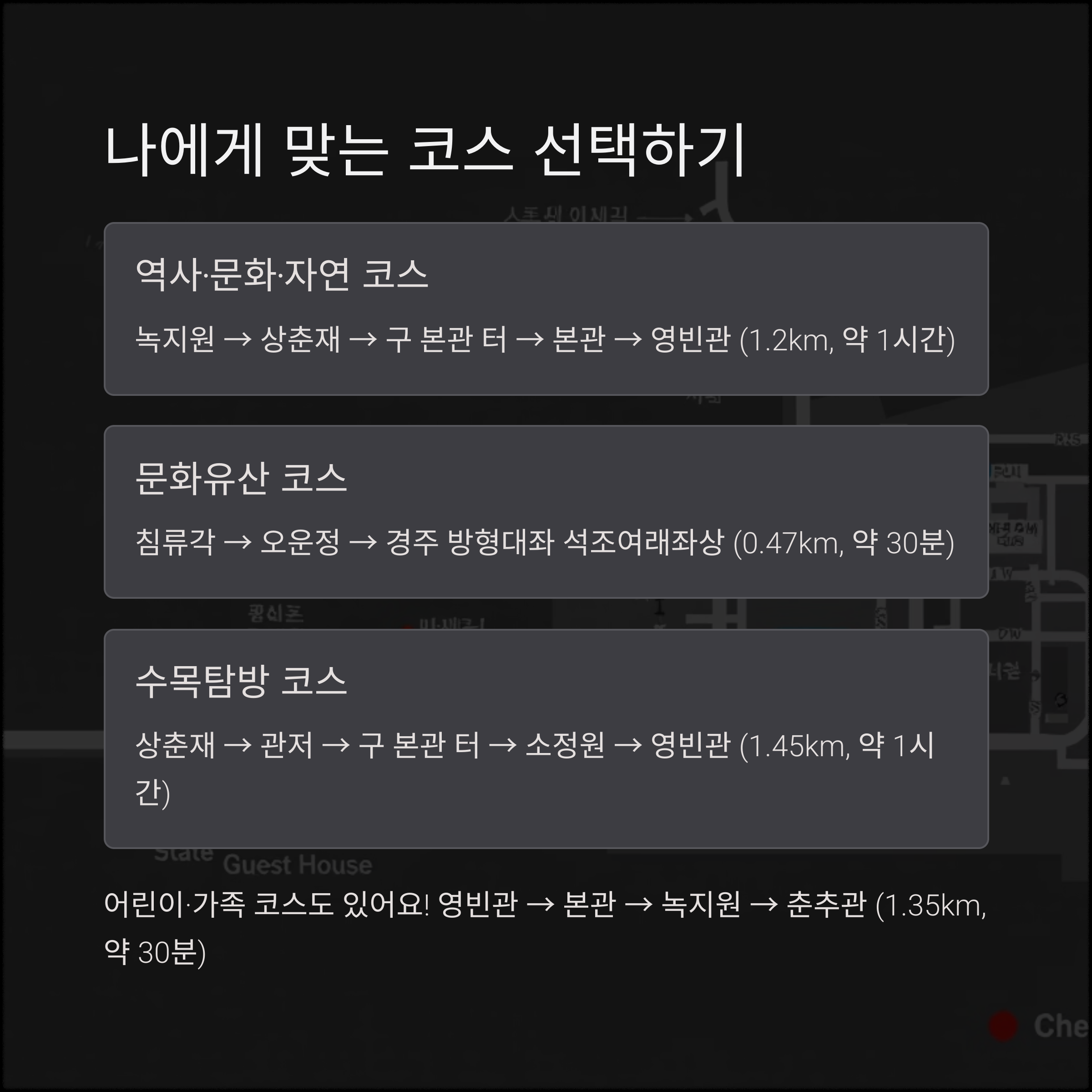 | 어린이·가족 코스 | 영빈관 → 본관 → 녹지원 → 춘추관 | 1.35km | 약 30분 |