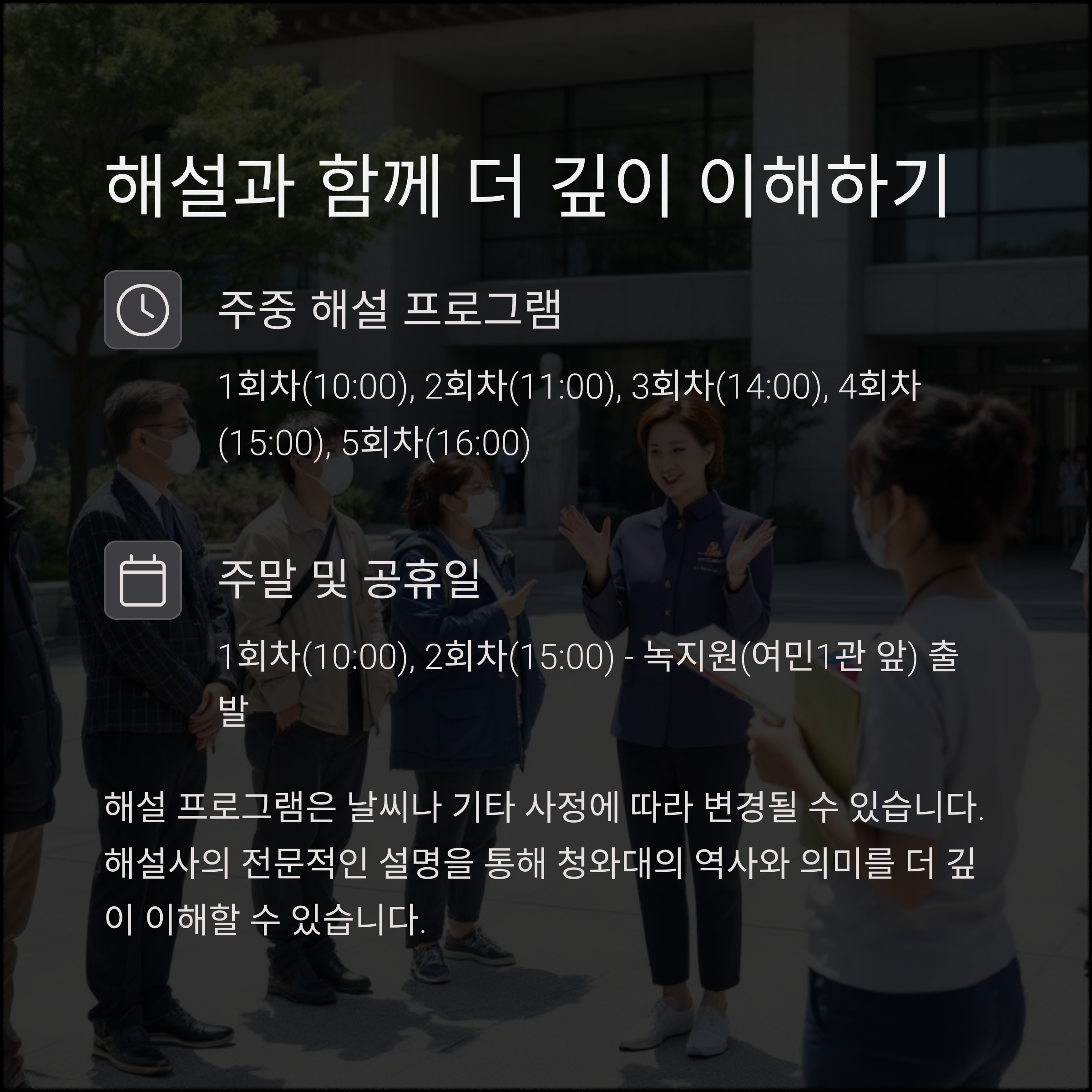 - 5회차: 16:00 시작, 청와대 본관 현관채 출발