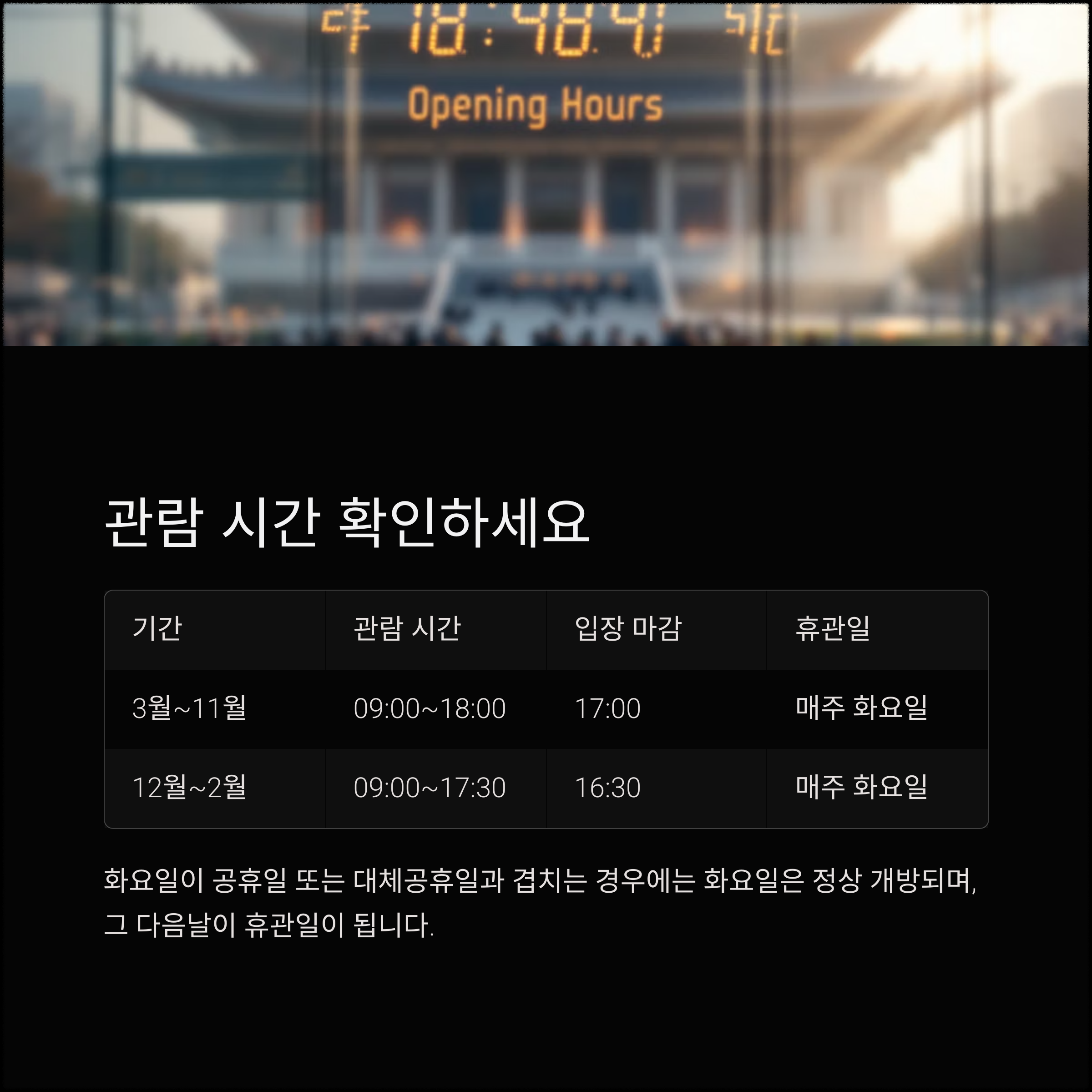 ※ 화요일이 공휴일 또는 대체공휴일과 겹치는 경우에는 화요일은 정상 개방되며, 그 다음날이 휴관일이 됩니다.