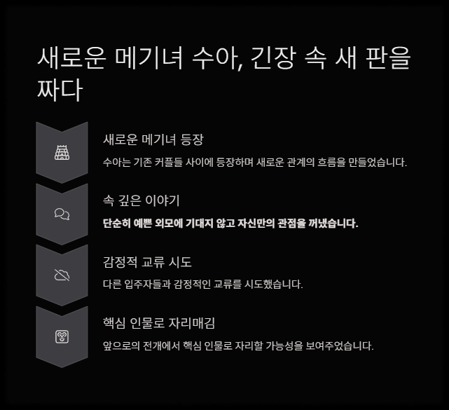 새로운 메기녀 수아의 등장은 관계 구도에 커다란 영향을 주었고