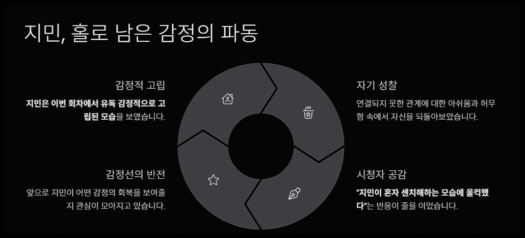 지민은 이번 회차에서 유독 감정적으로 고립된 모습을 보였습니다