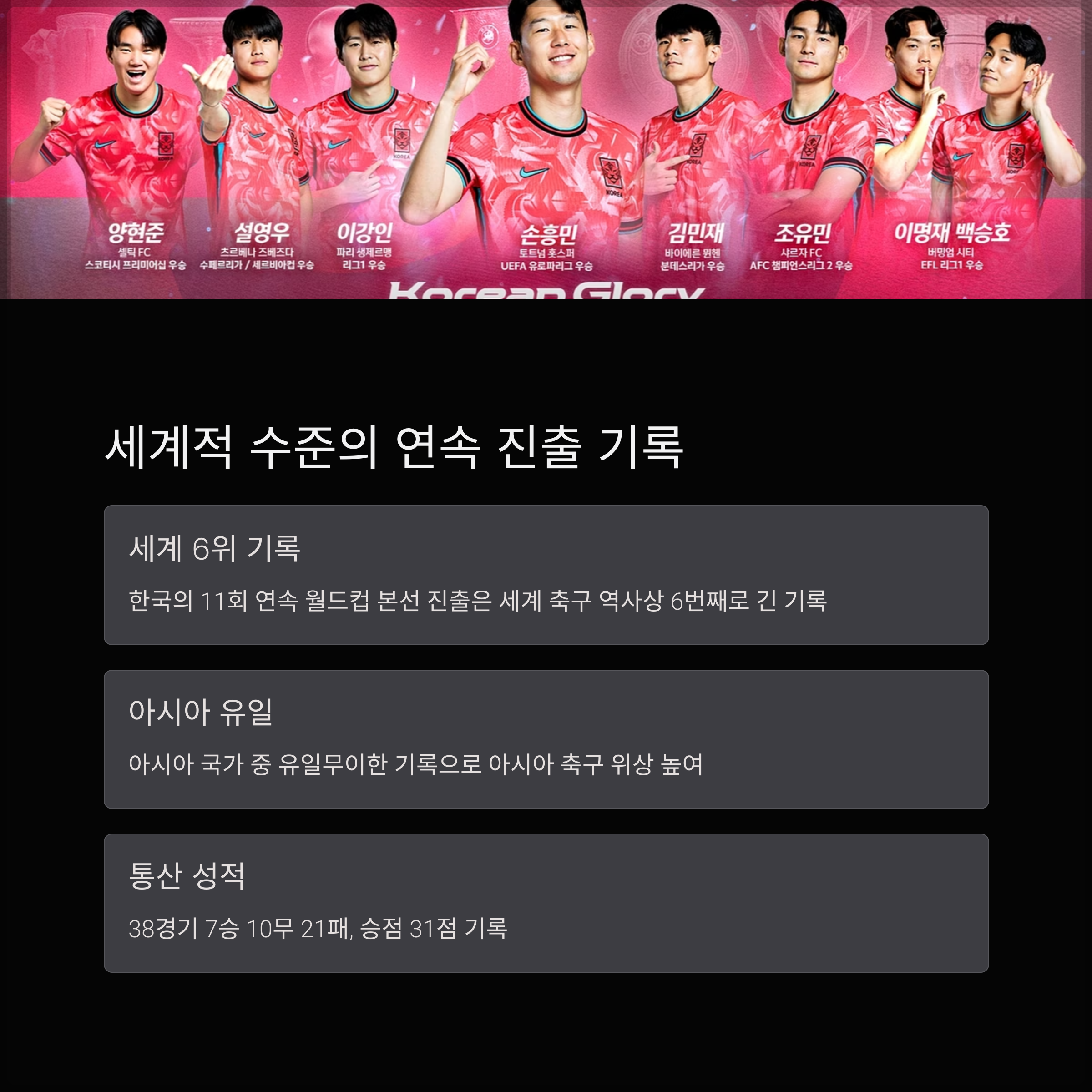 11회 연속 본선 진출을 확정한 한국은 이제 2026년 북중미 월드컵에서의 성과에 관심이 모아지고 있다. 48개팀으로 확대된 본선에서 한국이 어떤 모습을 보여줄지, 그리고 2002년 월드컵 이후 다시 한번 세계를 놀라게 할 수 있을지 기대가 크다.
