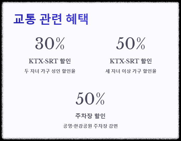 일상생활에서도 다양한 혜택이 제공됩니다. KTX/SRT는 두 자녀 가정은 성인 요금 30% 할인, 세 자녀 이상 가정은 성인 요금 50% 할인 받을 수 있어요. 주차 요금도 공영주차장과 한강공원 주차장은 50% 할인, 공항 주차장은 최대 80% 할인됩니다. 다자녀 가족은 이제 공항에서 패스트트랙을 이용할 수 있어 여행이 한결 편해졌습니다. 세 자녀 이상 가구는 전기요금 월 최대 16,000원, 가스요금 월 최대 18,000원, 난방비 월 최대 4,000원의 공공요금 감면 혜택을 받을 수 있습니다. 전기차를 구매한다면 두 자녀 가정은 100만 원, 세 자녀 가정은 200만 원의 추가 보조금도 지원됩니다. 이런 생활 혜택들을 모두 활용하면 연간 수백만 원의 가계 부담을 덜 수 있습니다!